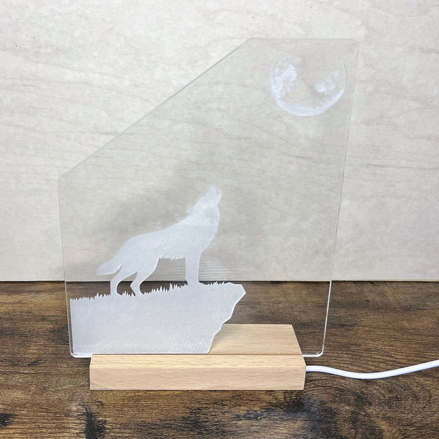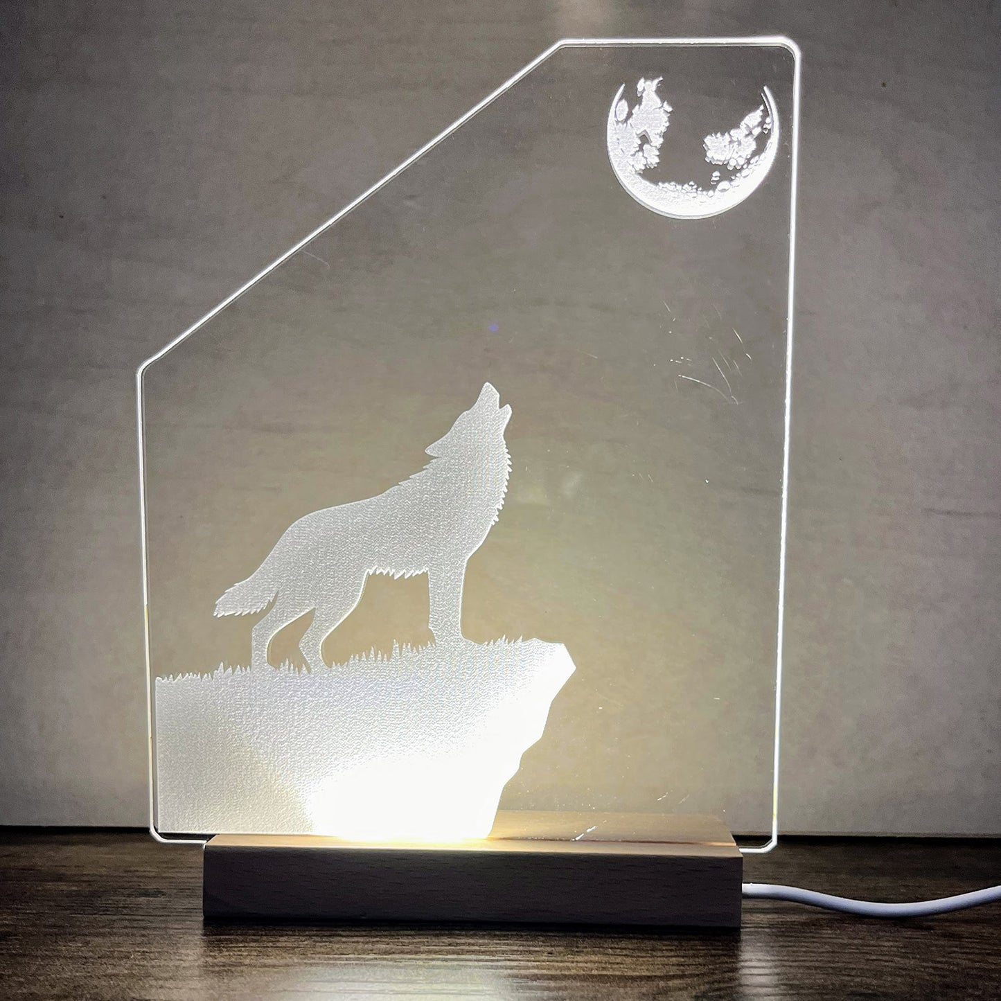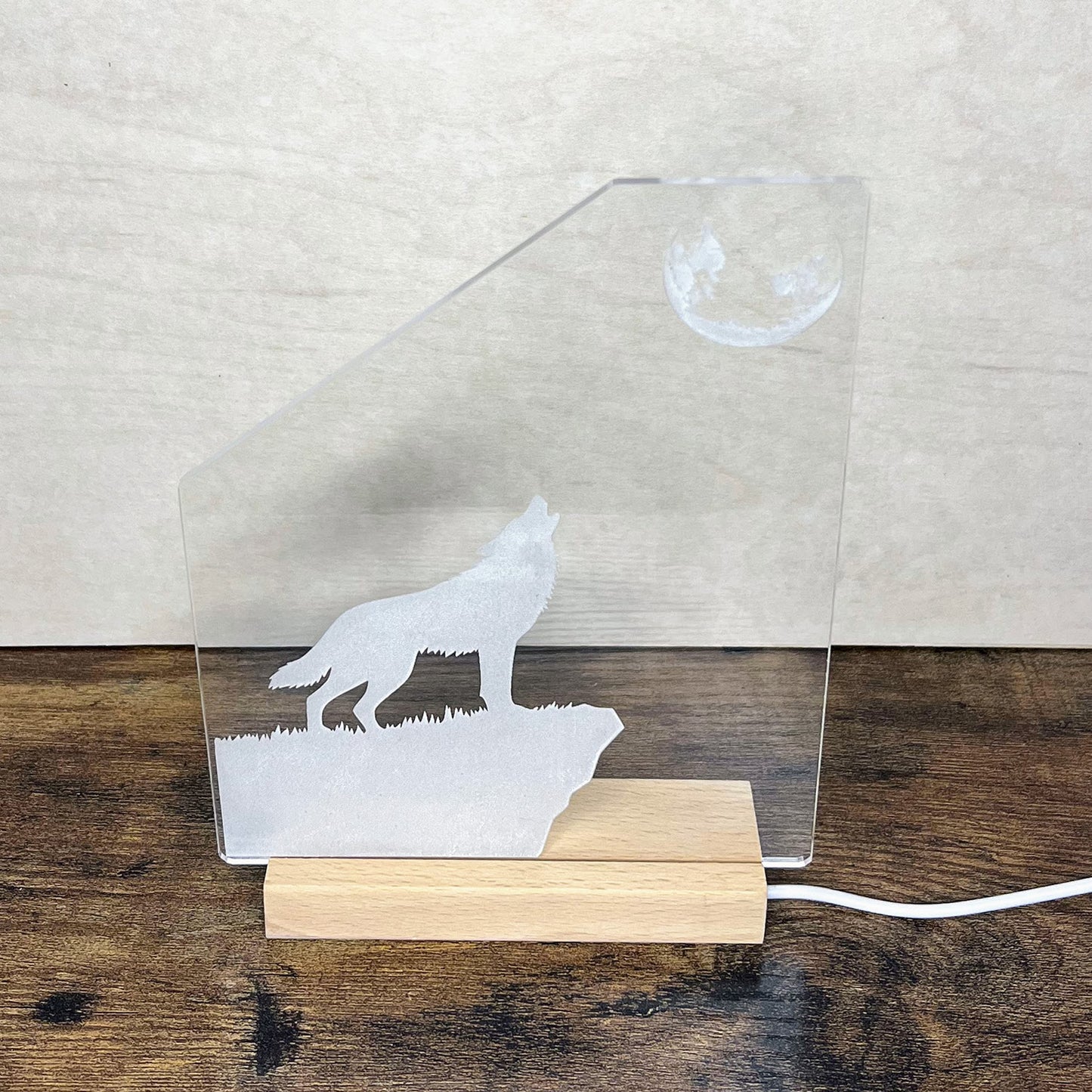 Join the wolf pack's howl at night with this nightlight. The large acrylic nightlight insert fits perfectly into an LED light base with a slot measuring 4.33 inches by 0.2 inches.