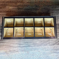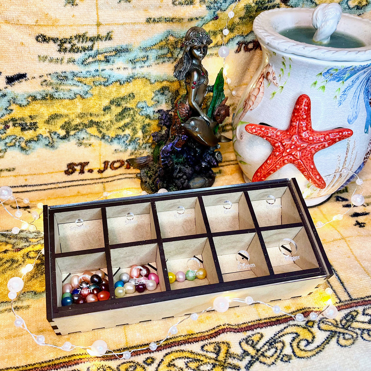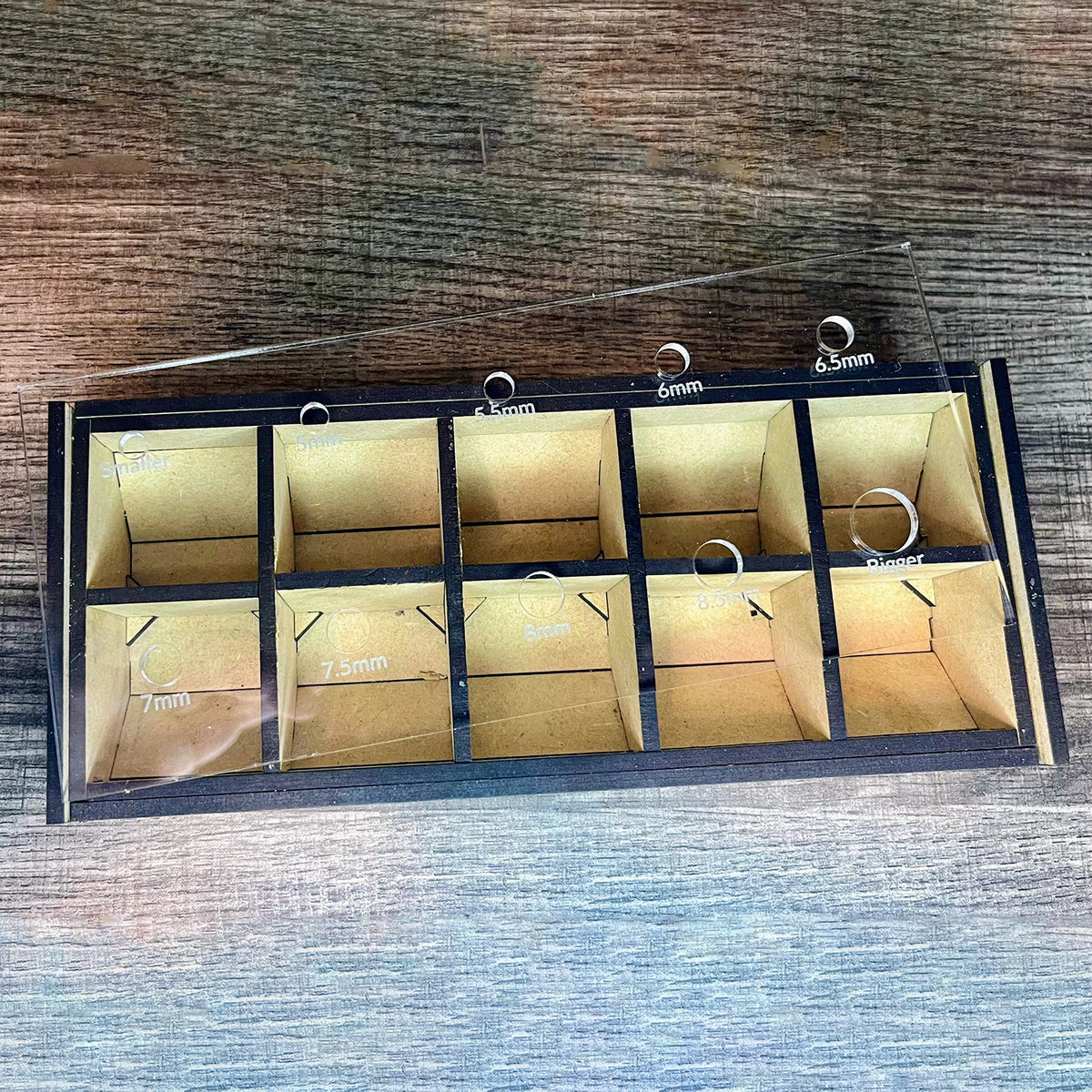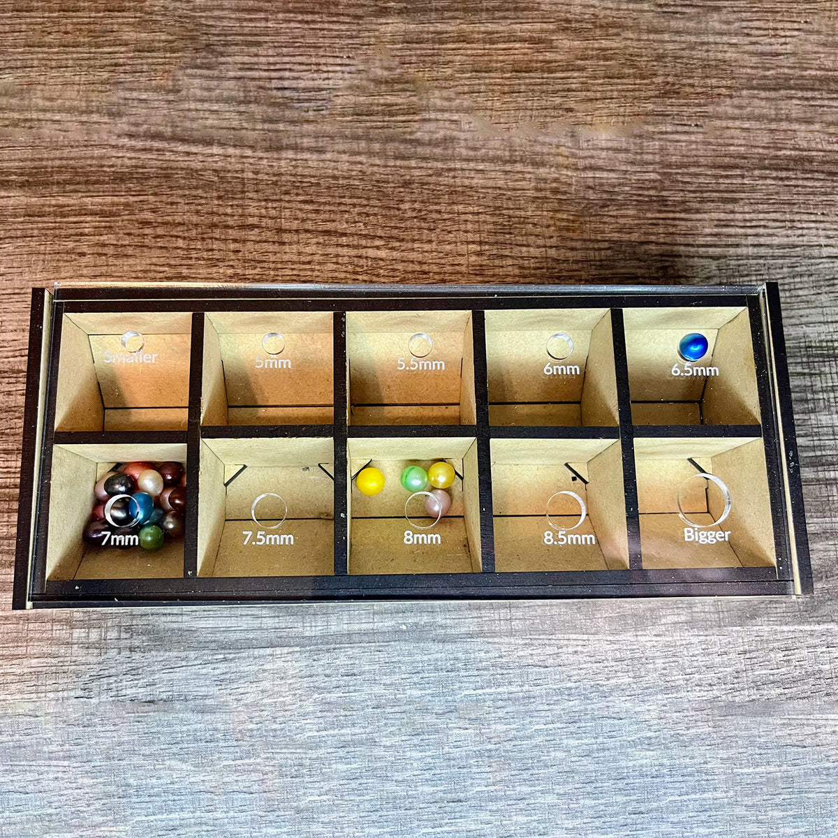 Needing a place to store and organize your beads or pearls for jewelry crafting? This is the perfect box for you! The clear acrylic lid has several holes ranging in sizes with increments of 0.5 mm. There are a total of 10 sections for giving you the right amount of organization you need for your jewelry needs.