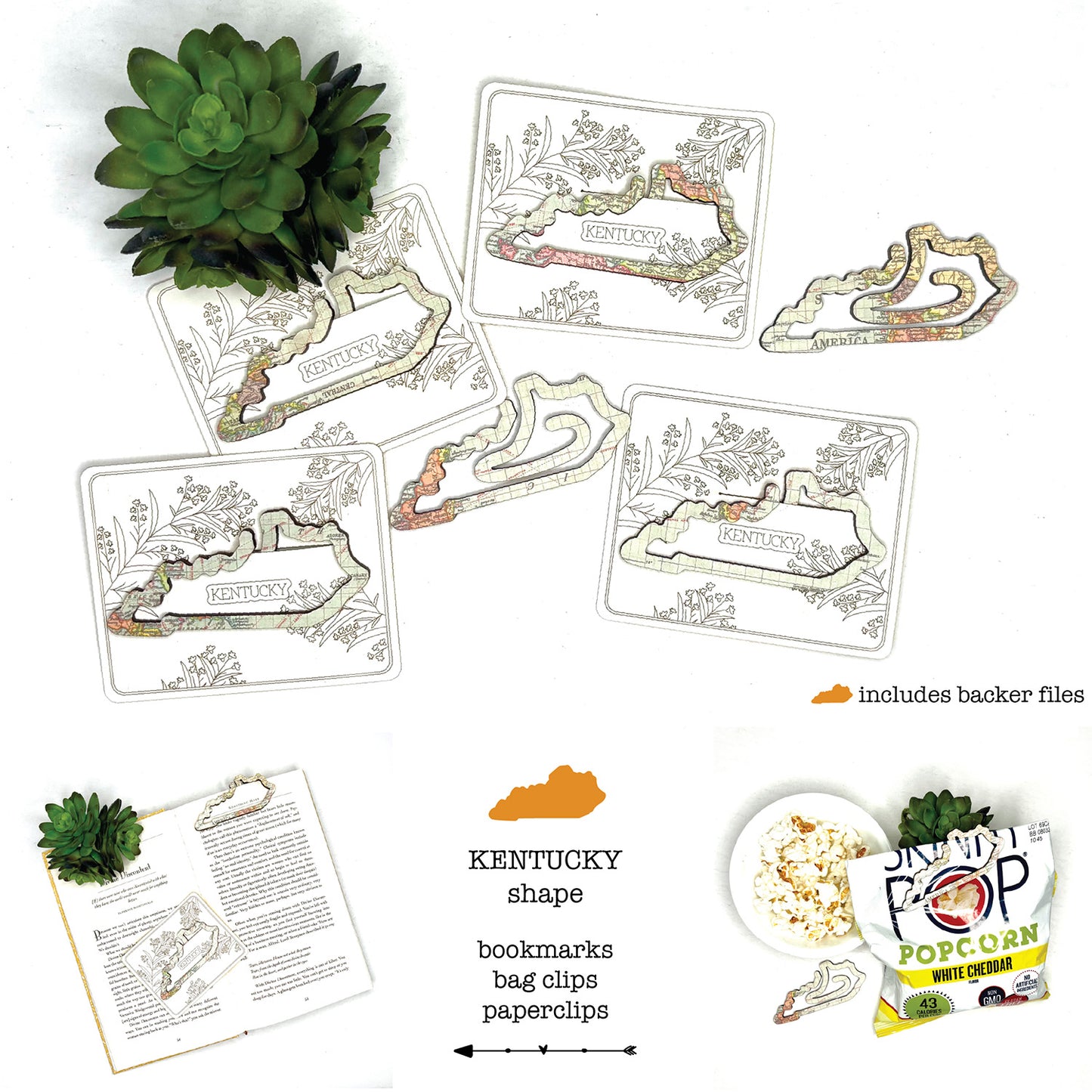 Kentucky state shaped bookmark laser file with state flower backer file. These are great book-lover gifts! Includes backer file that can be scored and cut on the laser on poster board using the 80 lb card stock paper Glowforge setting. These make great scrapbusters! Slide them into a self-sealing cellophane bag and you've got a great little add-on product that sells well at markets, bookstores, or as a promo gift. To create a patterned look, Mod Podge scrapbook paper to 1/8" wood, let dry, mask with low tack masking tape, and cut.