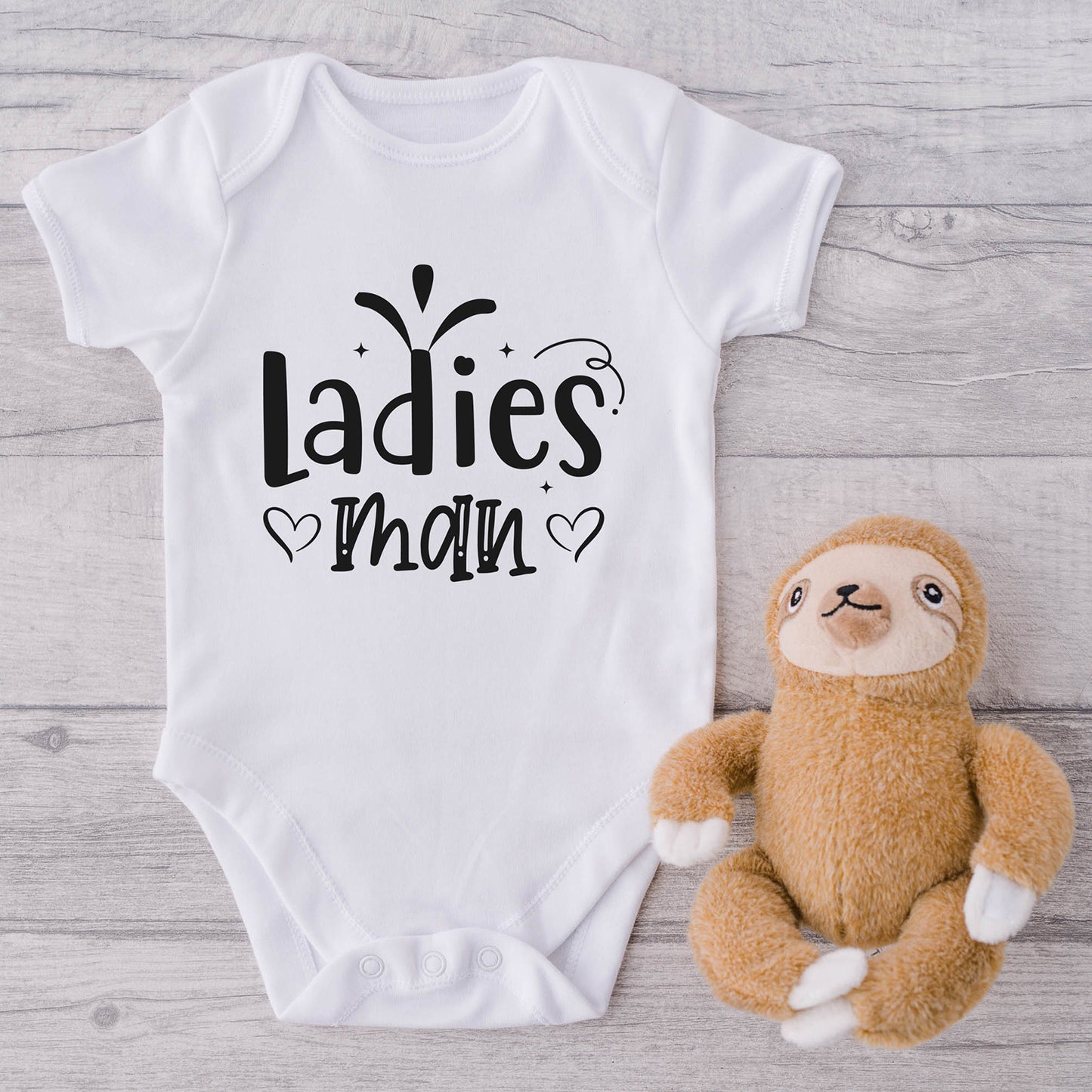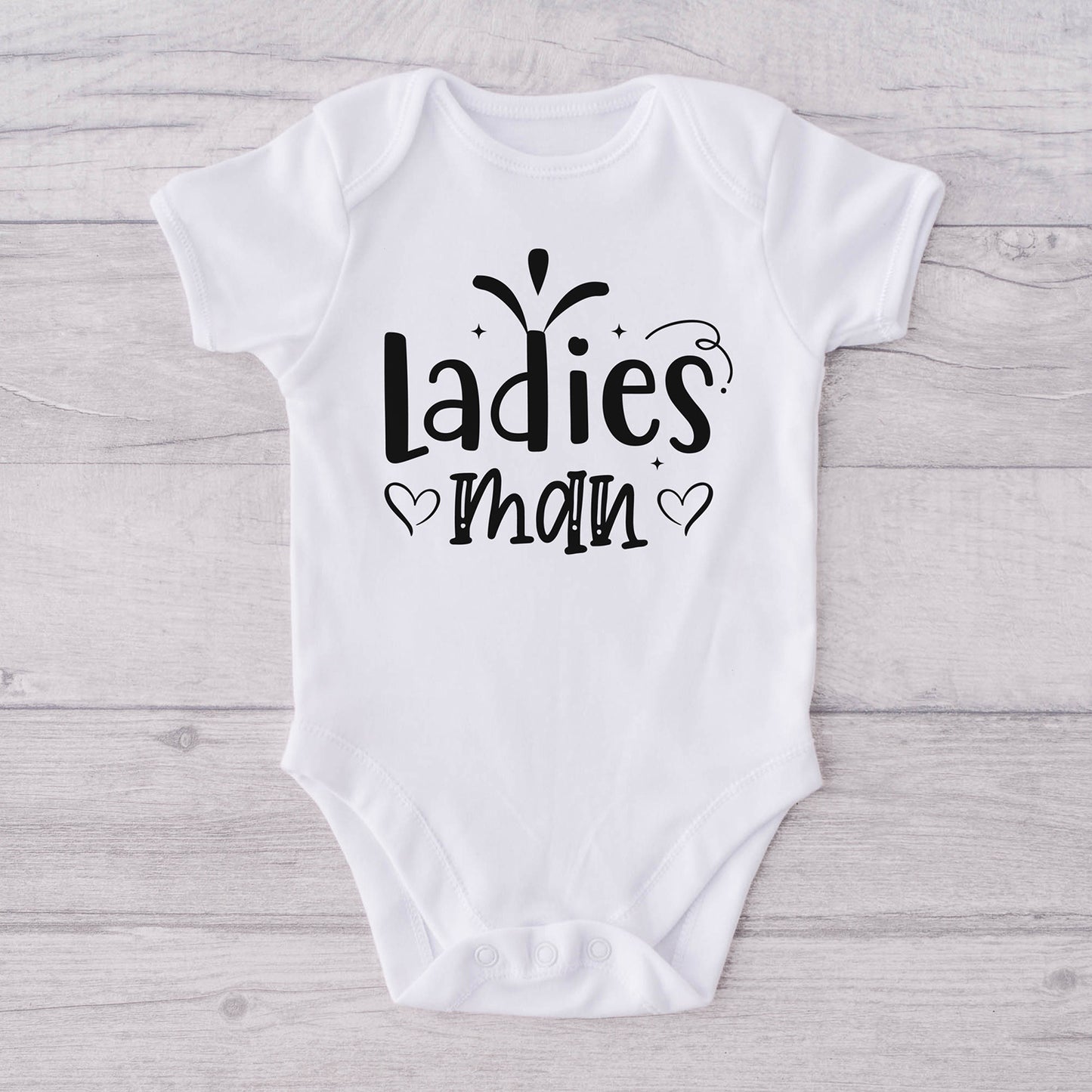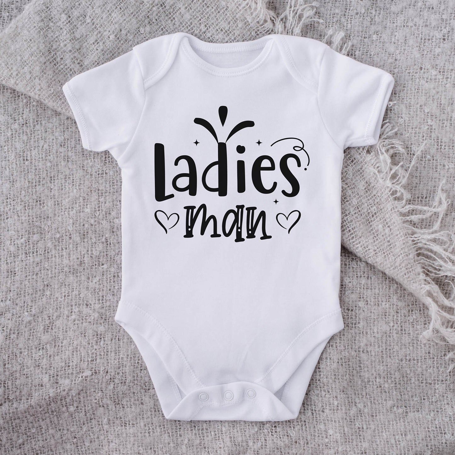 Get ready to melt hearts with our "Ladies Man" Baby Onesie graphic. Crafted with high-quality material for laser cutting, this graphic adds a touch of charm and style to your baby's wardrobe, celebrating their irresistibly adorable nature.