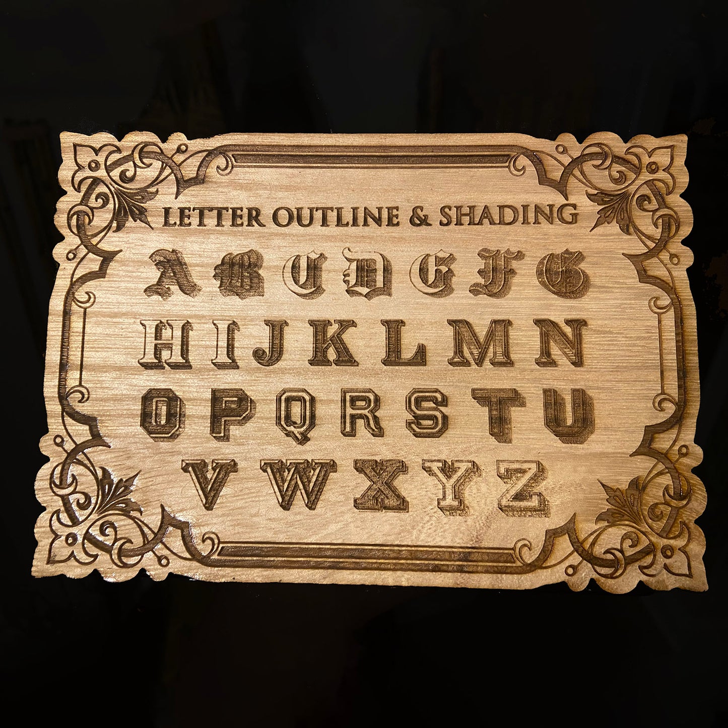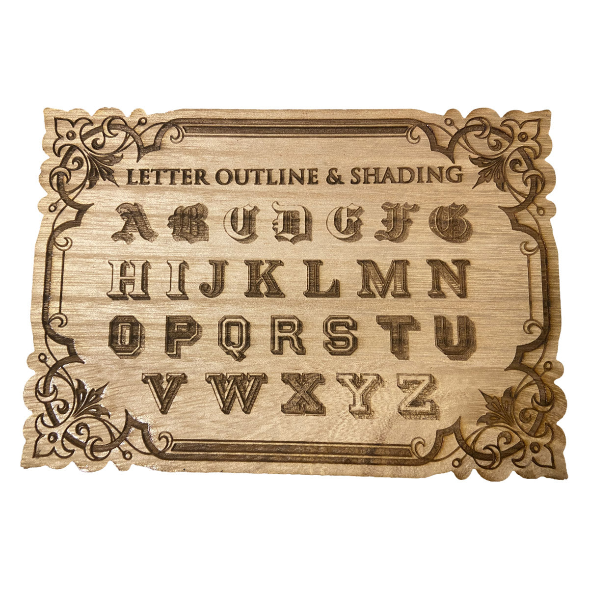 Shows the alphabet in various styles of outline and shading.