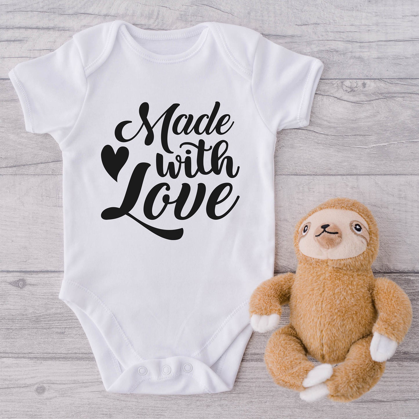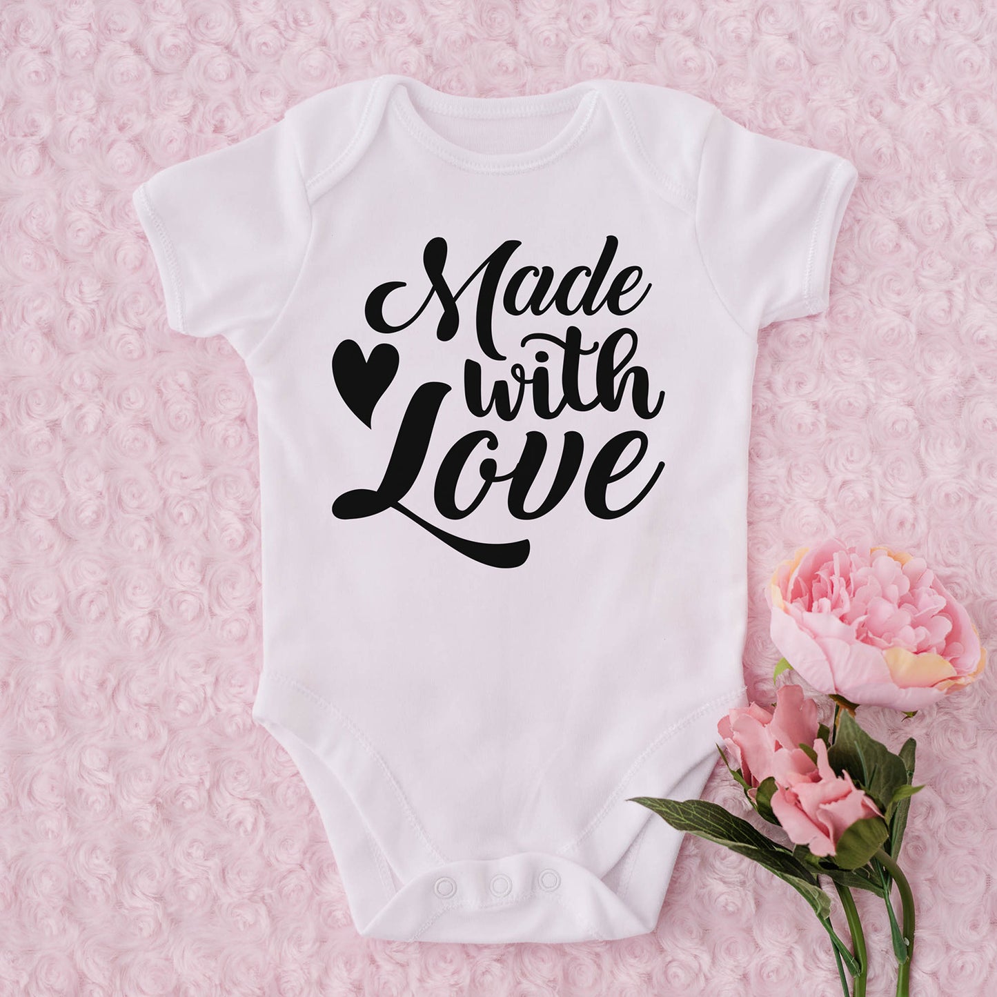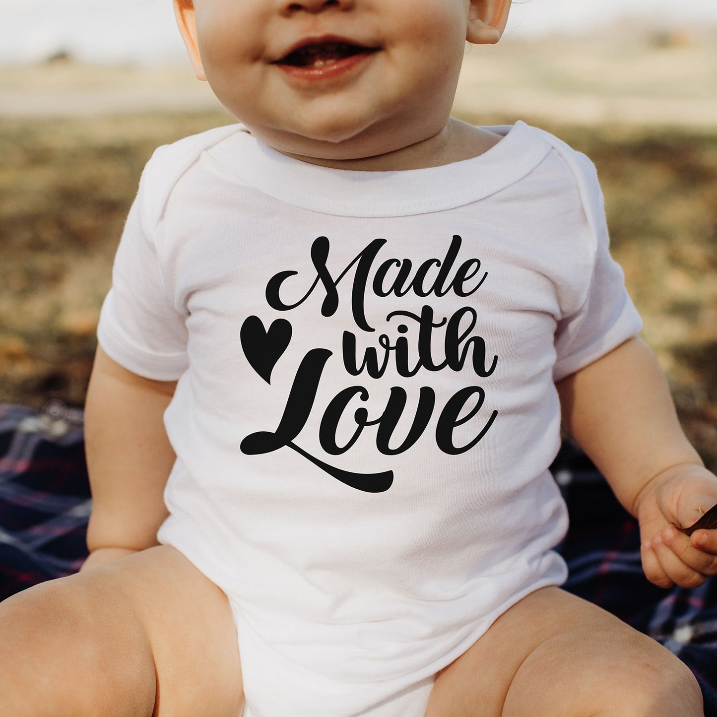 The "Made With Love" With Heart Baby Onesie graphic is a delightful addition to your baby's wardrobe and a heartfelt expression of the love that surrounds them. Let this laser cut graphic be a reminder of the affection and care that fills your baby's life, and a statement piece that brings smiles and warmth to everyone around.