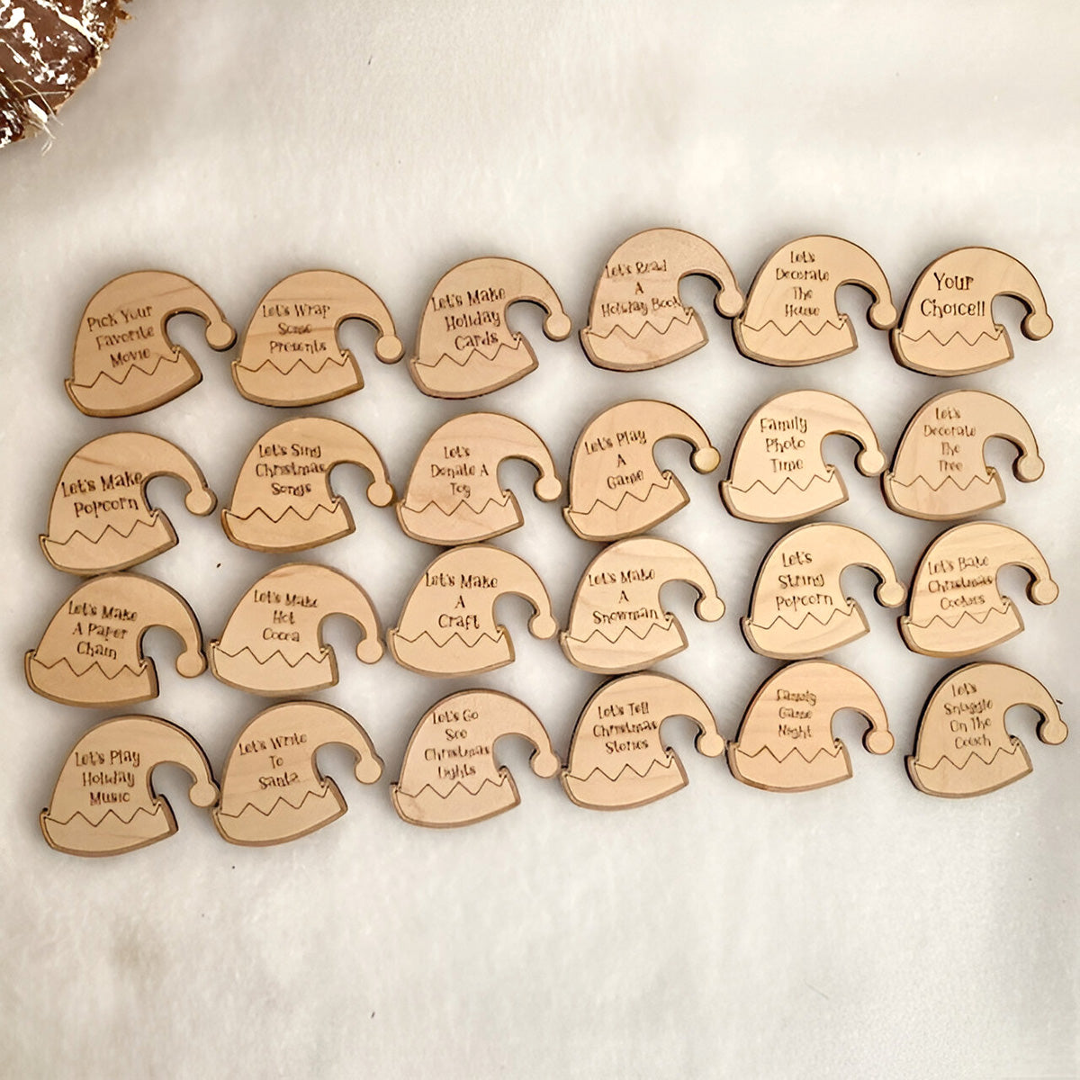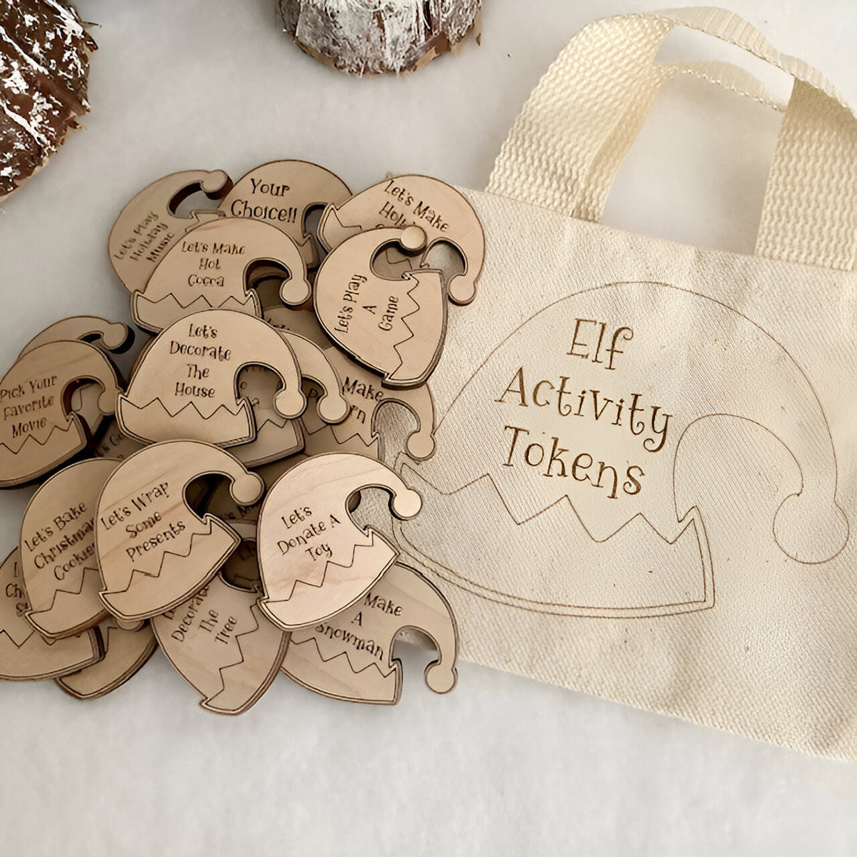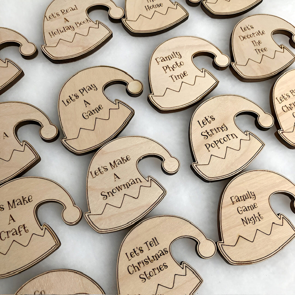 An enchanting set of 24 laser cut tokens adorned with activities to do with your holiday Christmas Elf. These tokens are a creative way to add variety and surprise to your Elf adventures throughout the Christmas season. Choose a token a day from the Elf and surprise your child with a fun activity. Great way to use up all that scrap material. Take it a step further and personalize a canvas bag to hold them in. The tote bag shown here was purchased at a craft store and engraved at 700/10.
