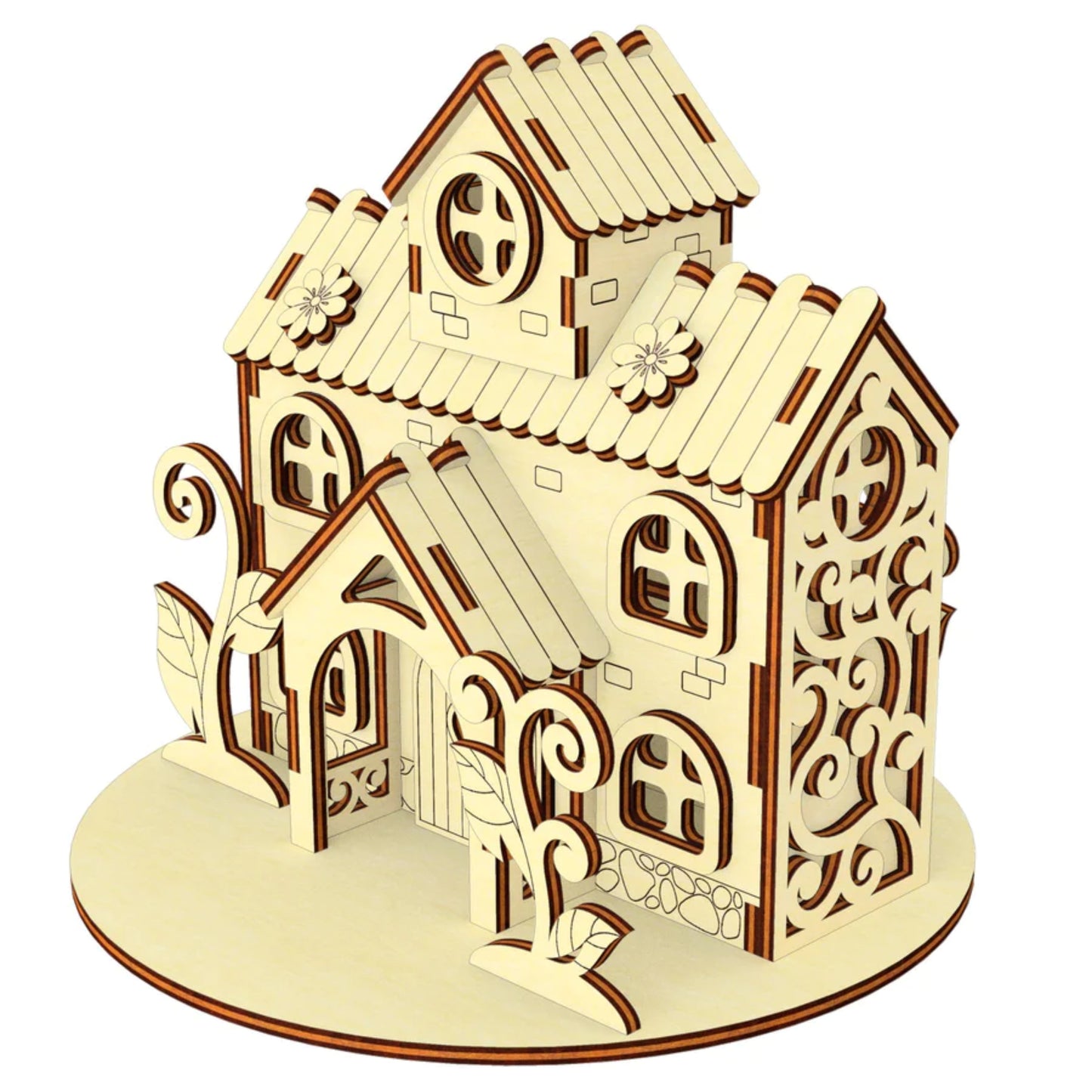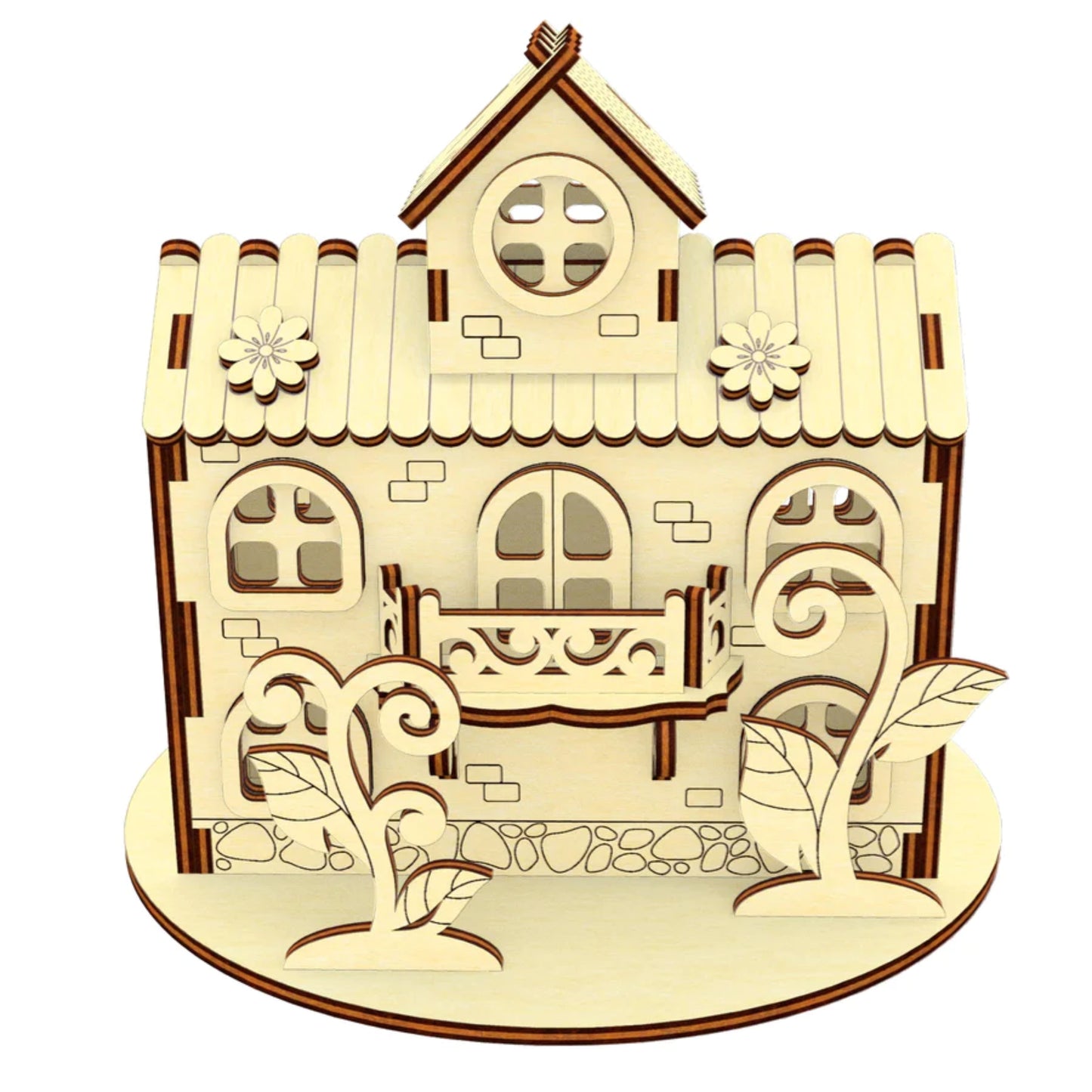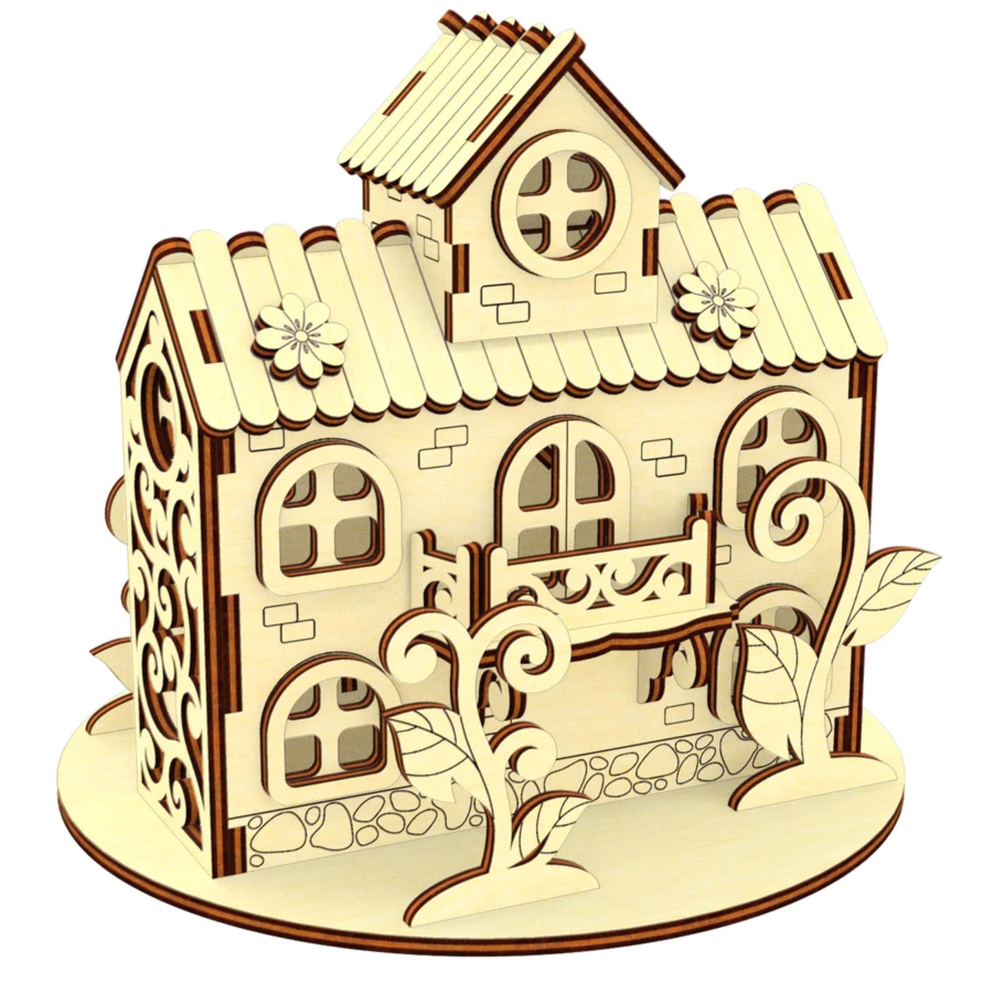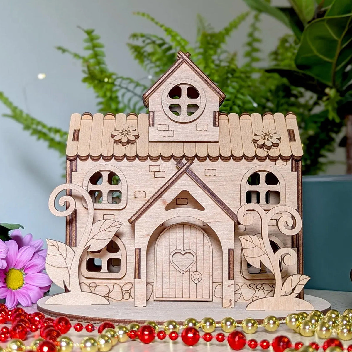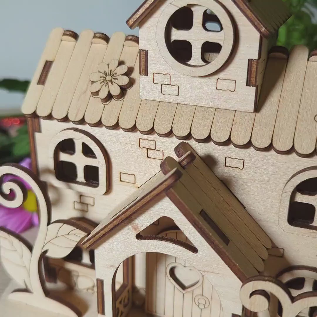 Discover the charming miniature house of the Herbal Fairy with flowers and plants, perfect for laser cutting. This small shelter boasts an attic, a porch, and charming climbing plants surrounded by plenty of vegetation. Immerse yourself in a world where the magic of nature thrives in miniature form.