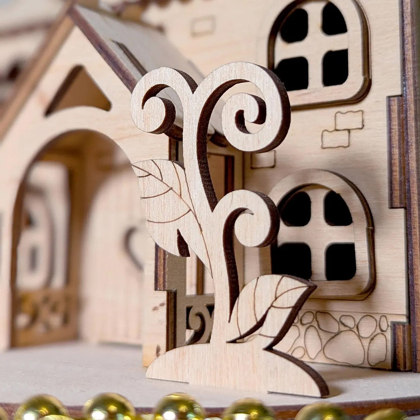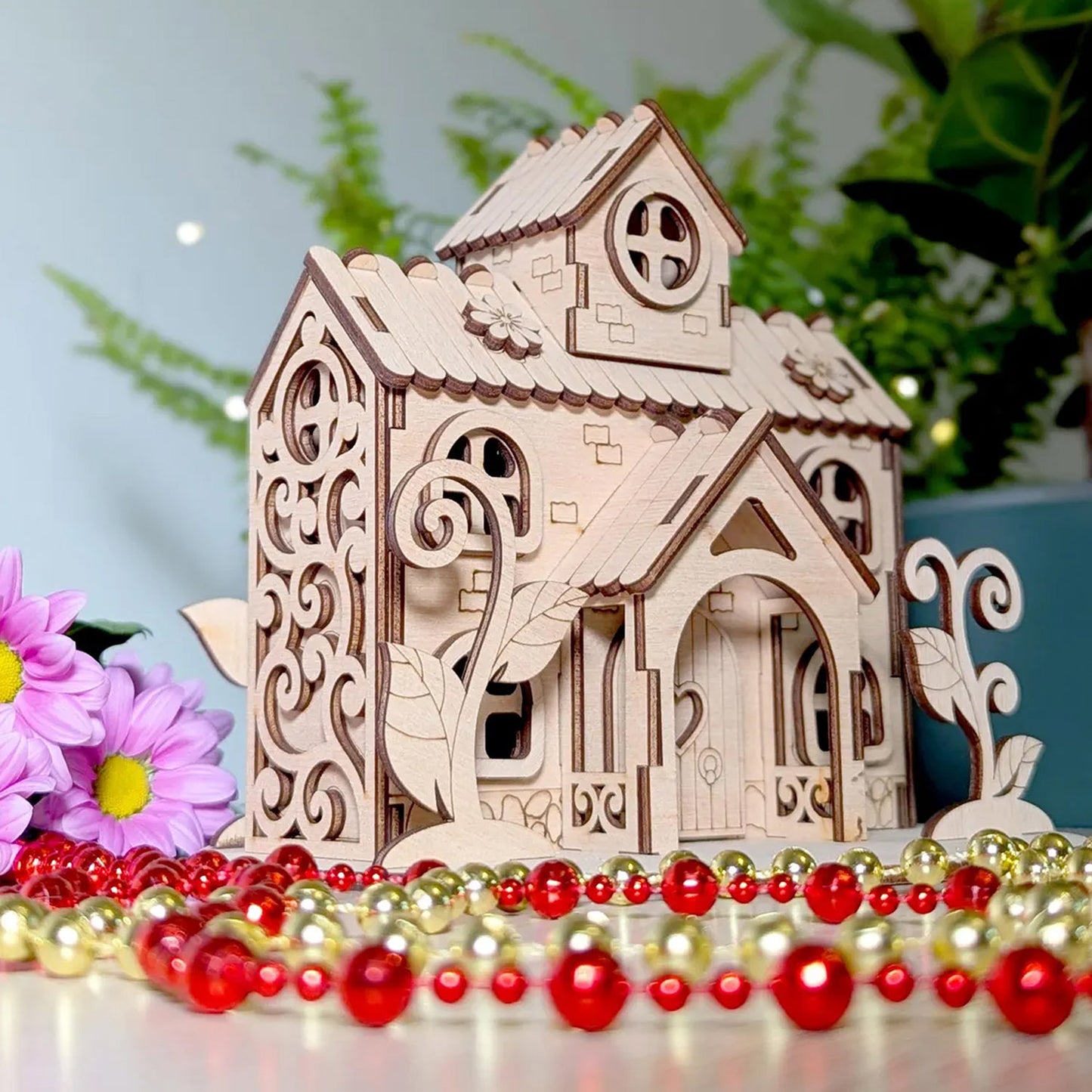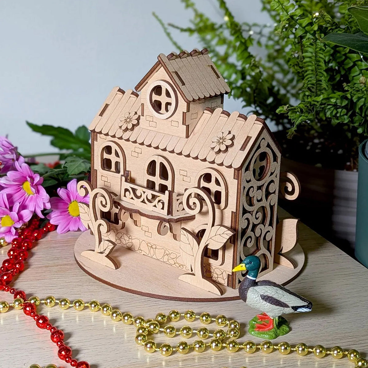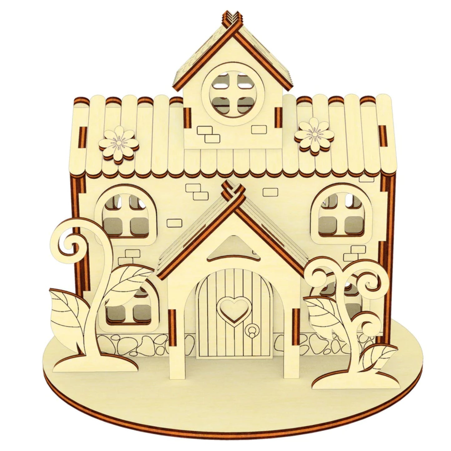 Discover the charming miniature house of the Herbal Fairy with flowers and plants, perfect for laser cutting. This small shelter boasts an attic, a porch, and charming climbing plants surrounded by plenty of vegetation. Immerse yourself in a world where the magic of nature thrives in miniature form.