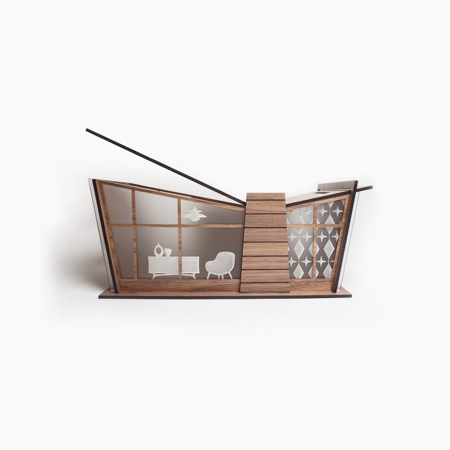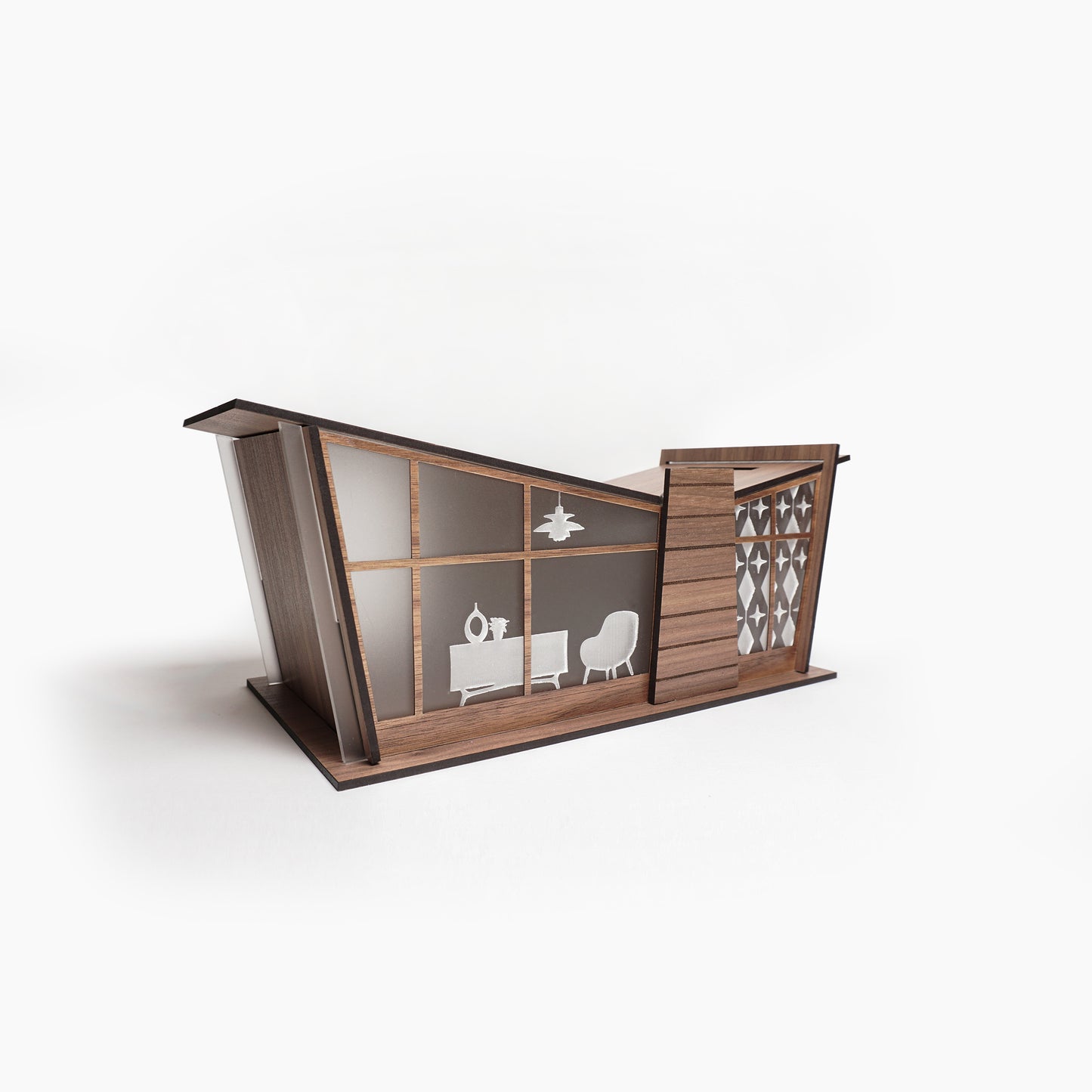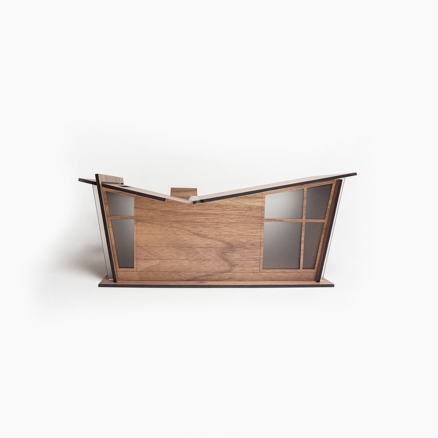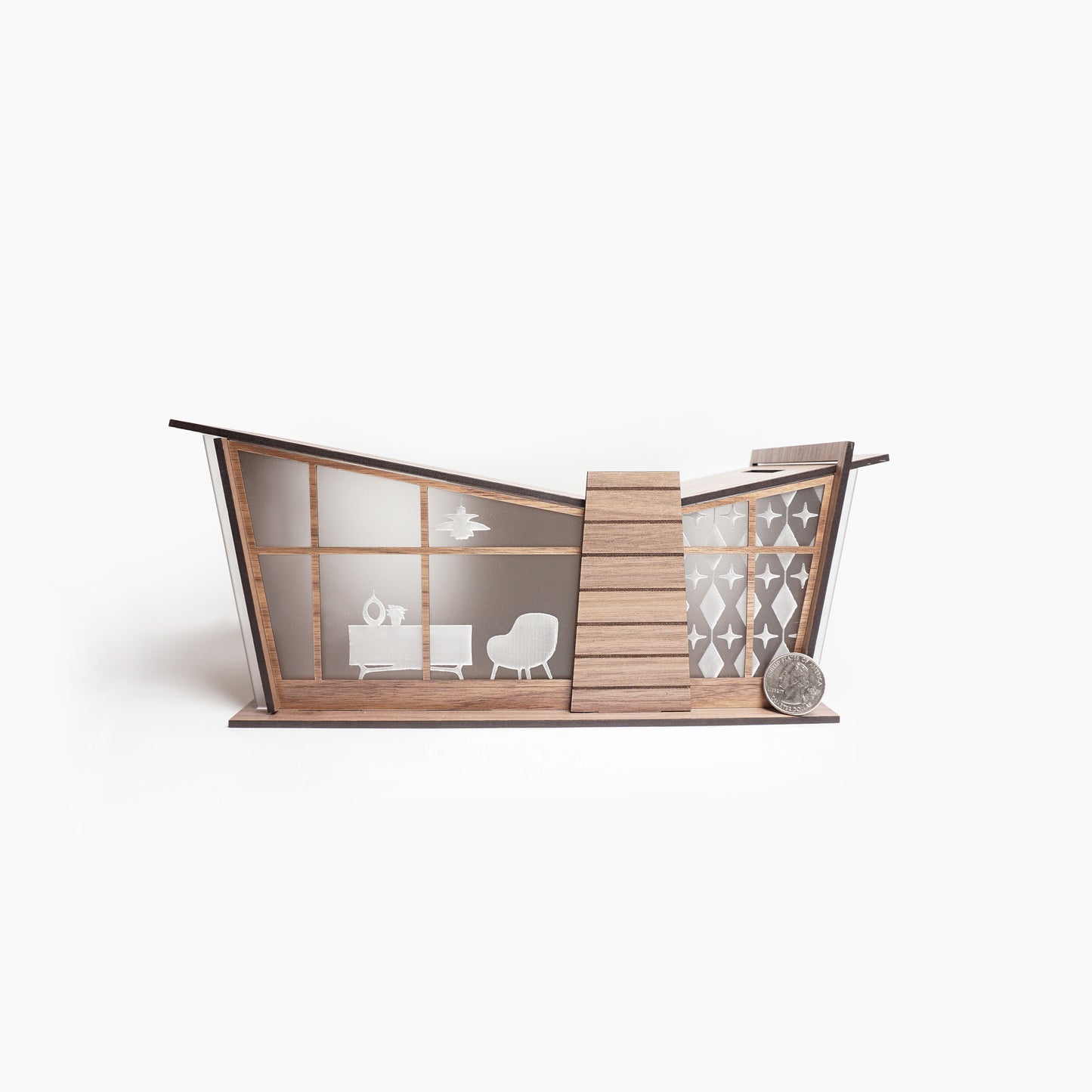 This mid-century modern inspired organizer is designed for laser cutting to be right at home on your countertop. The vaulted butterfly ceiling design gives you room to store your keys and wallets on one side, and your loose changes in a piggybank on the other side.