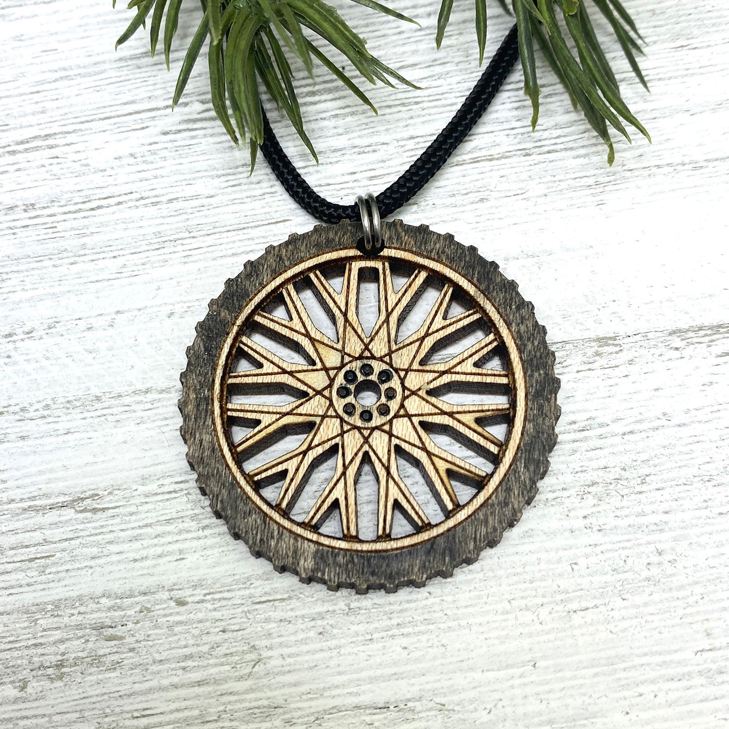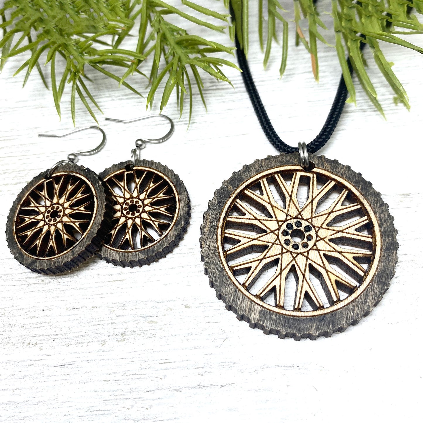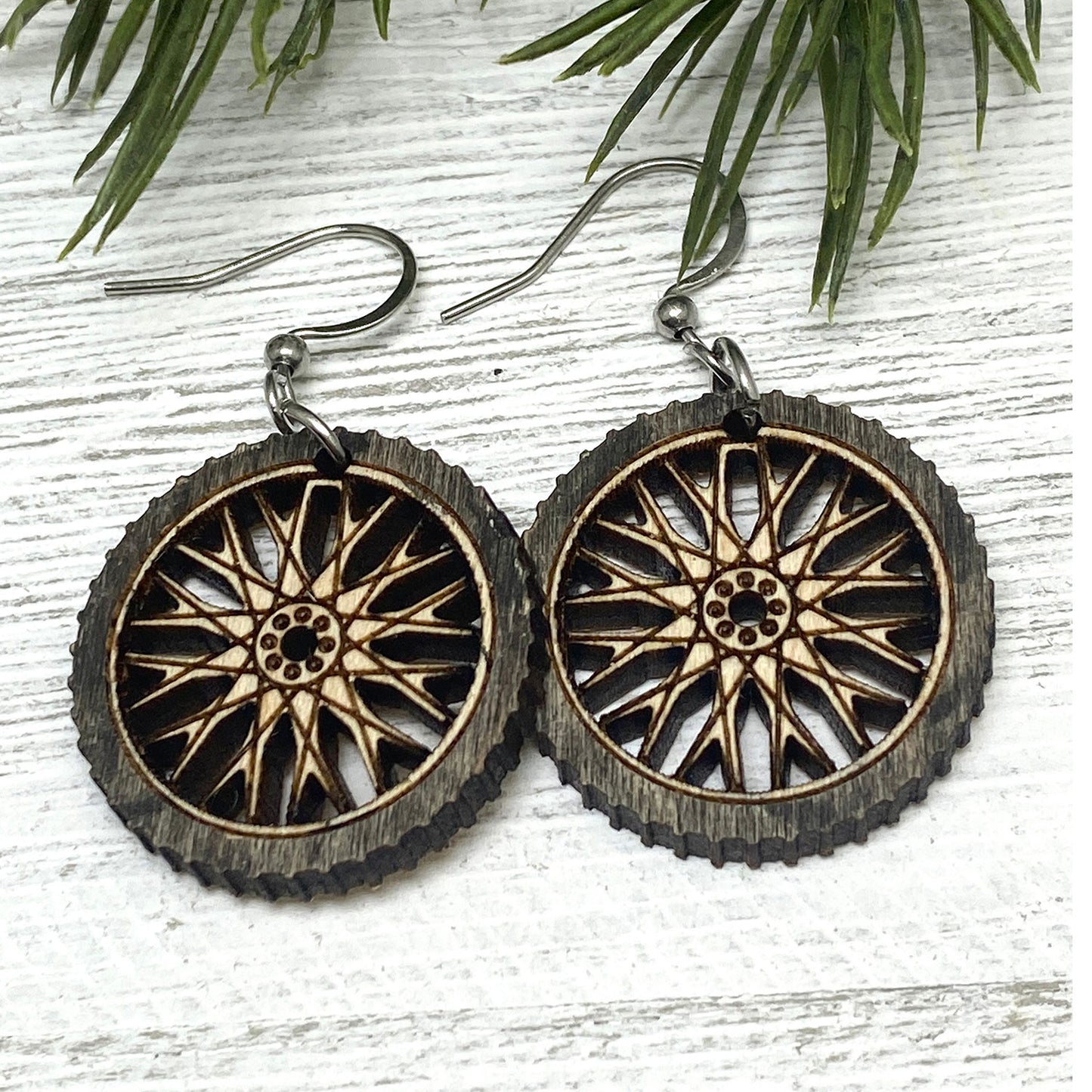 Mountain bike tire pendant and earring set for laser cutting. Rustic fat tire details, quick and easy cuts, quick painting details.