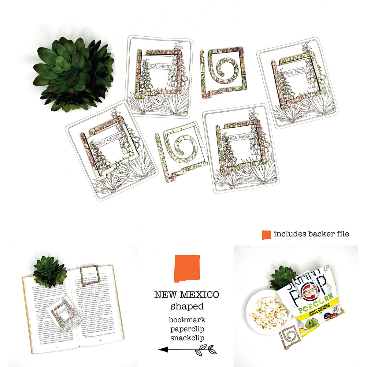 New Mexico state-shaped bookmark laser file with state flower backer file. These are great book-lover gifts! Includes backer file that can be scored and cut on the laser on poster board using the 80 lb card stock paper Glowforge setting. These make great scrap busters! Slide them into a self-sealing cellophane bag and you've got a great little add-on product that sells well at markets, bookstores, or as a promo gift. To create a patterned look, mod podge scrapbook paper to 1/8" wood, let dry, mask with low tack masking tape and cut!