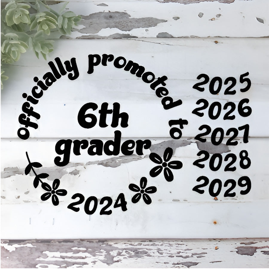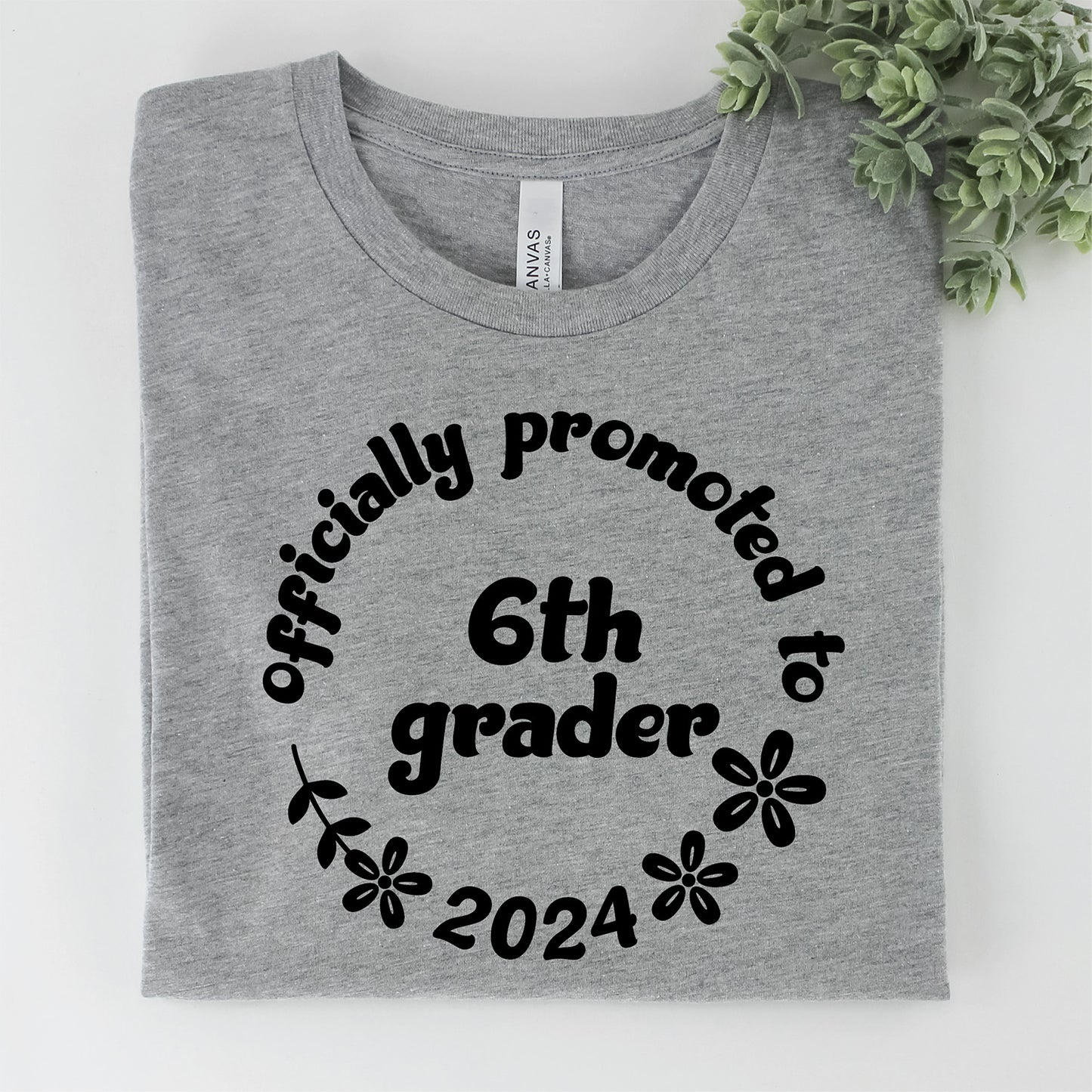 Mark the end of fifth grade or the start of sixth grade with this Officially Promoted to 6th Grader graphic. Featuring a retro-style font and flowers, this design is perfect for creating t-shirts, engraving on party decorations, or a variety of gifts. Extra years 2025-2029 are included. Coordinating designs are also available for other grades.
