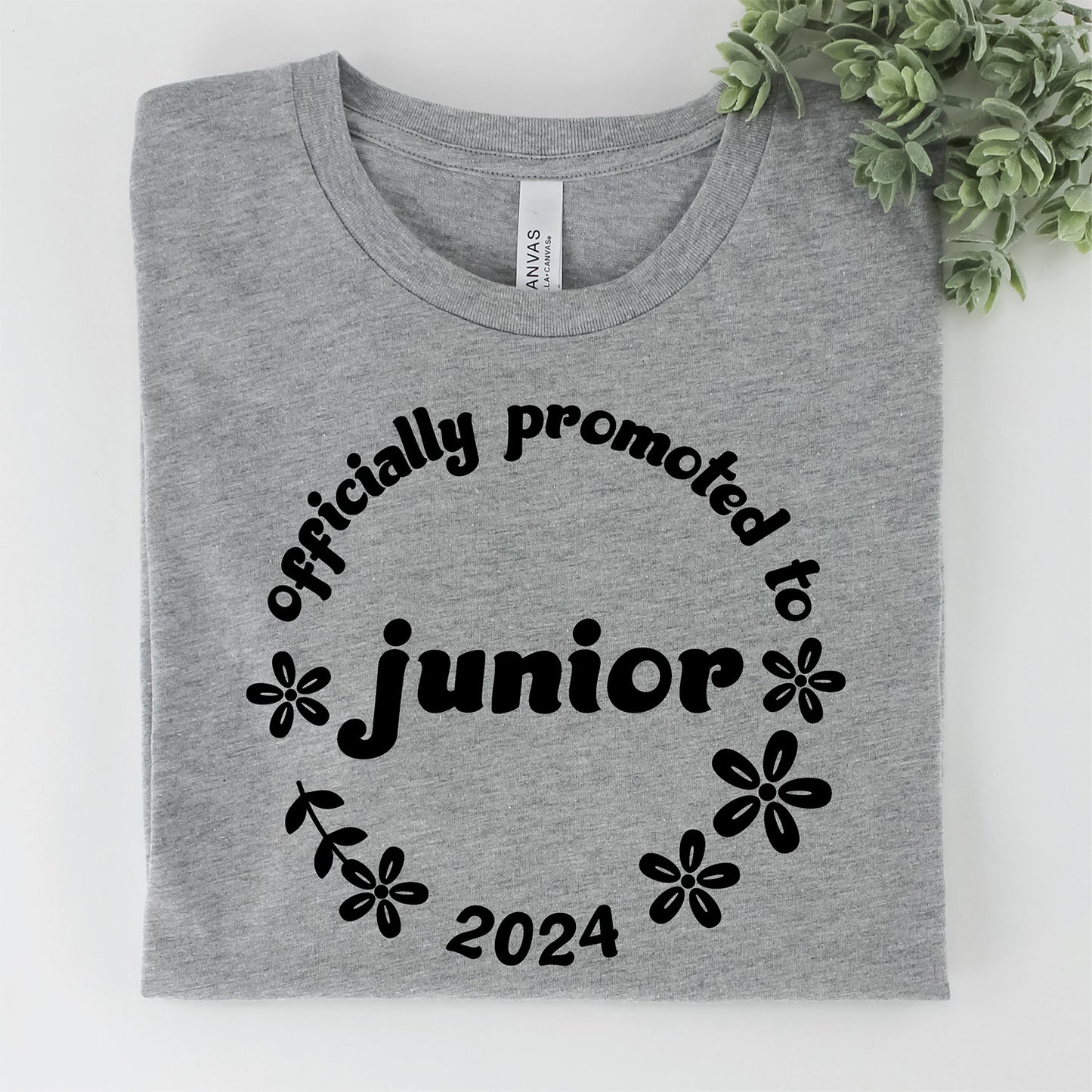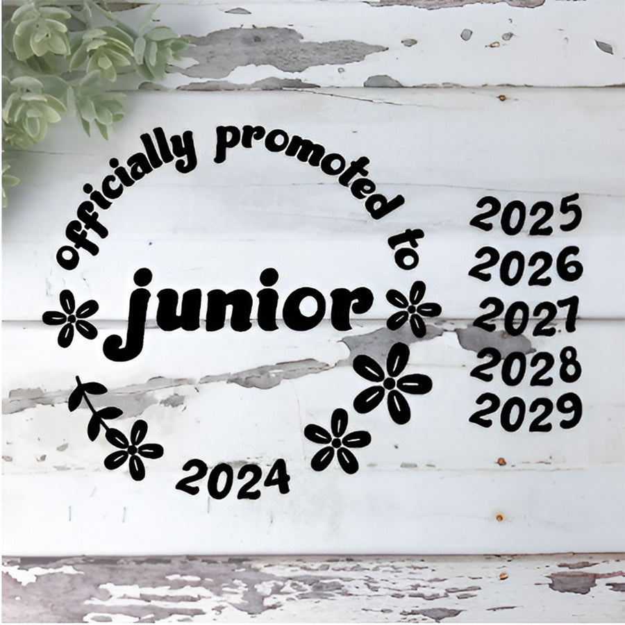 Make the end or beginning of your school year unforgettable with this unique and trendy design! Our Officially Promoted to Junior graphic, featuring a retro-style font and flowers, is perfect for creating t-shirts, engraving on party decorations, or a variety of gifts. Extra years 2025-2029 are included. Coordinating designs are also available for other grades.