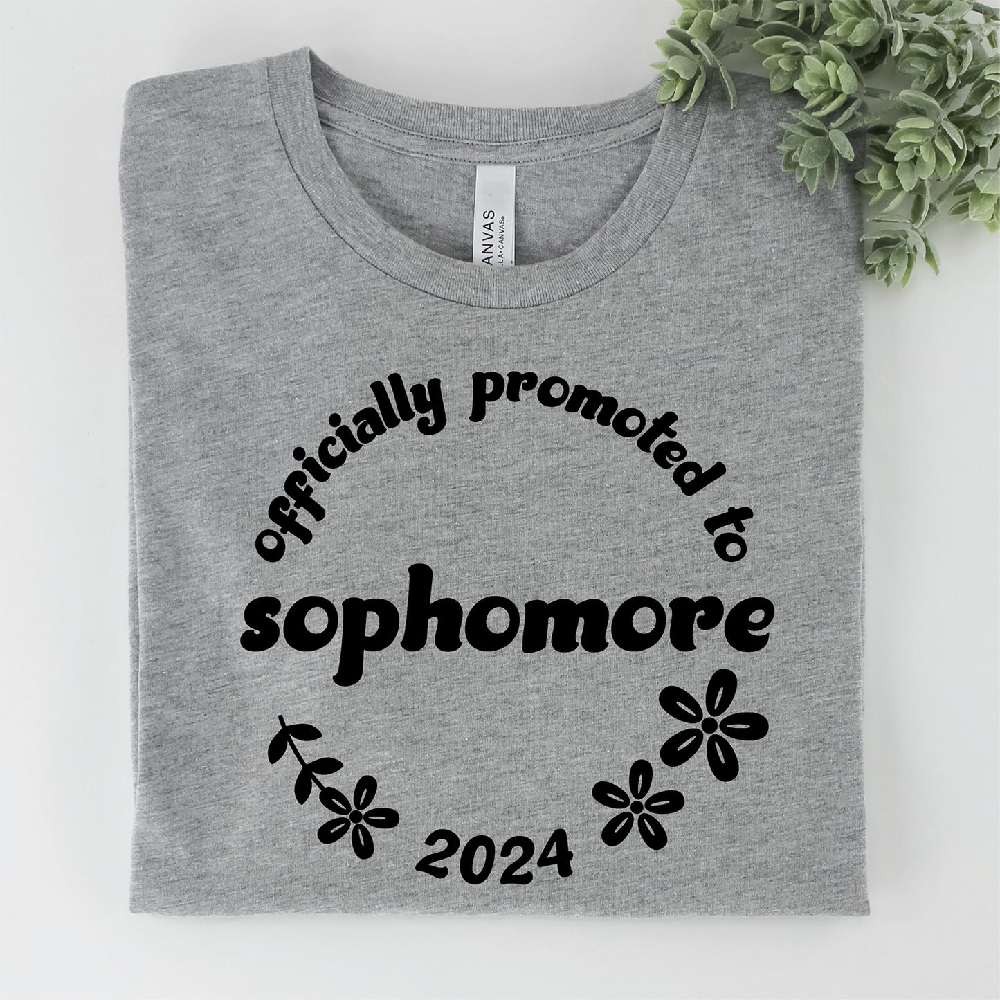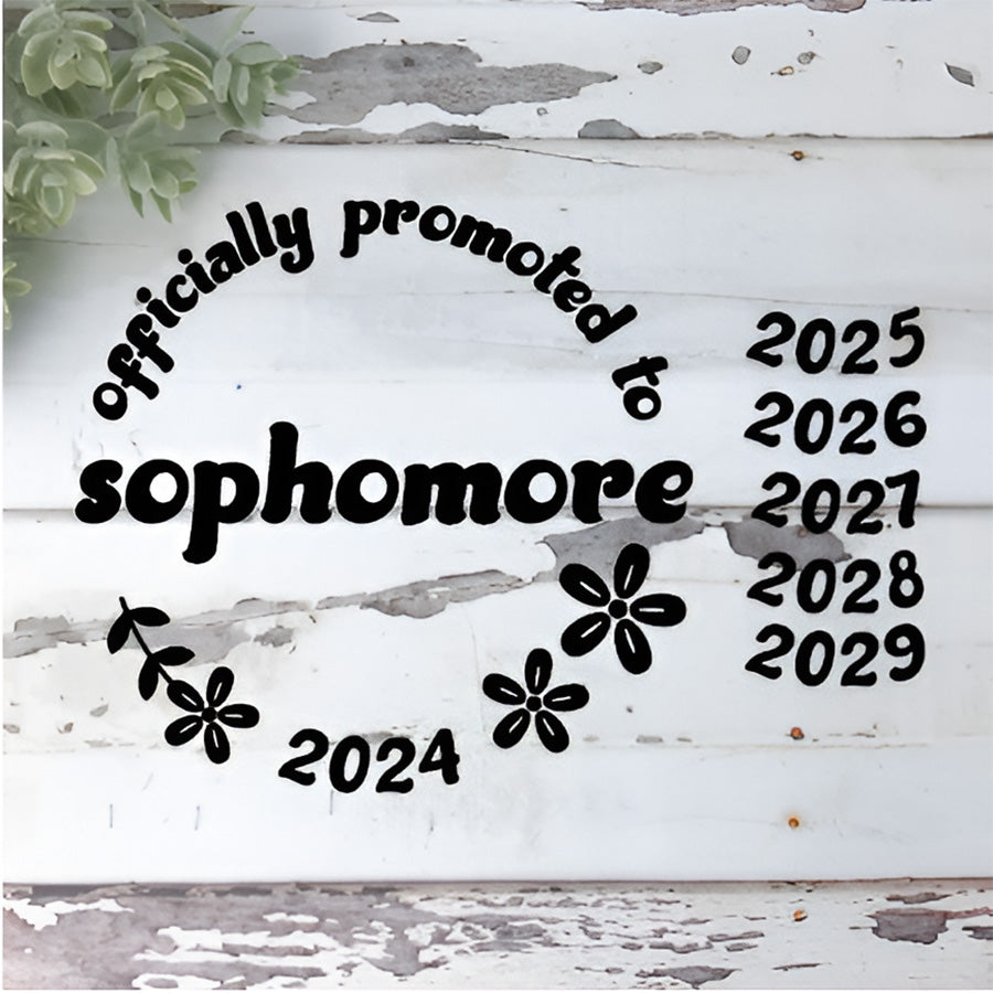 Make the end or beginning of this school year unforgettable with this unique and trendy design! Our Officially Promoted to Sophomore graphic, featuring a retro-style font and flowers, is perfect for creating t-shirts, engraving on party decorations, or a variety of gifts. Extra years 2025-2029 are included. Coordinating designs are also available for other grades.