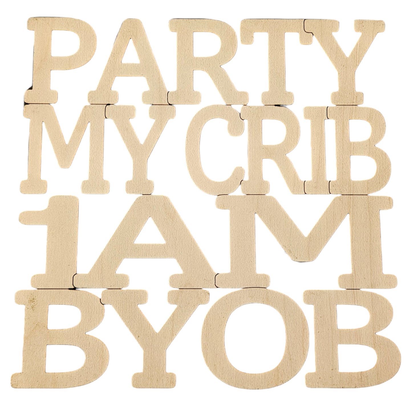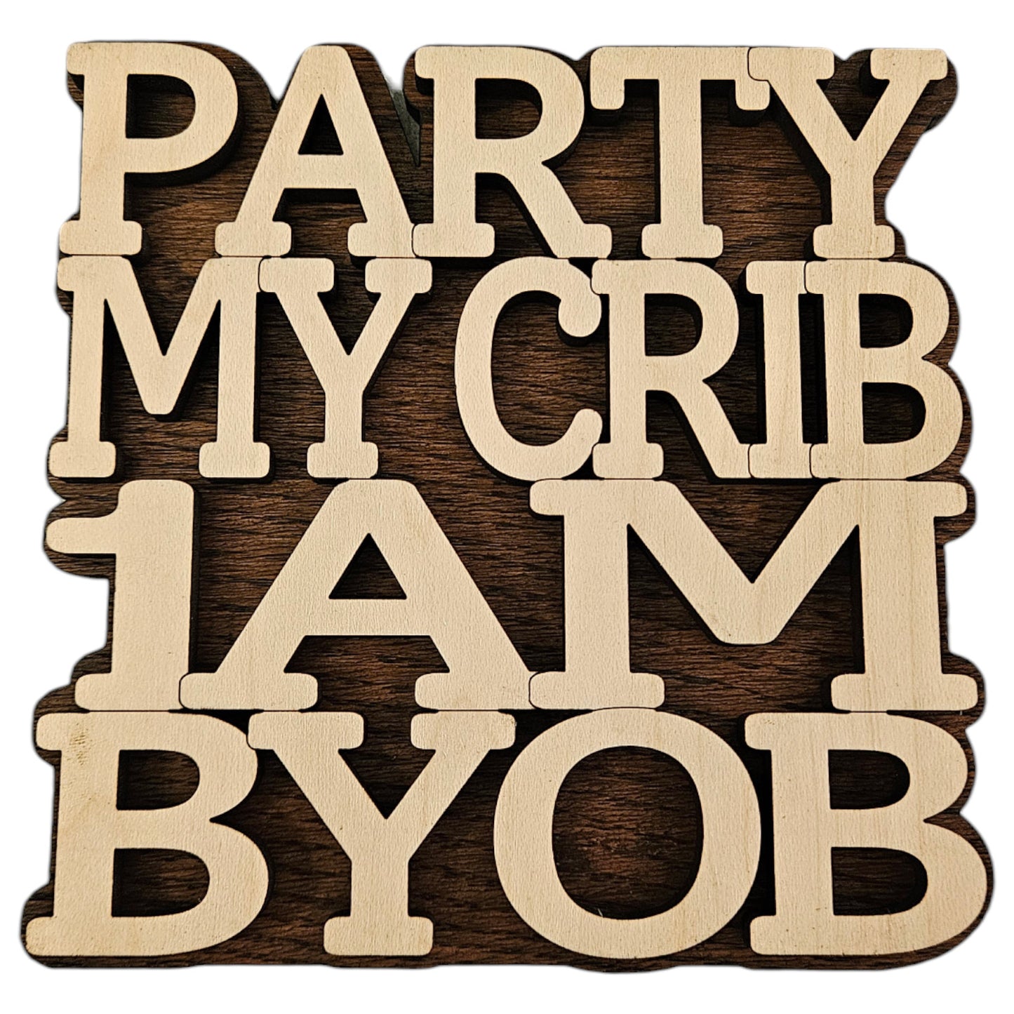 This "Party, My (Baby) Crib, 1AM, BYOB (Bring Your Own Bottle)" sign is perfect for any nursery. This two-layer design measures 5.2" wide by 5.2" tall, but can be resized to any dimensions. It can be displayed on a wall with command strips / mounting hardware (not included) or on an easel (not included).