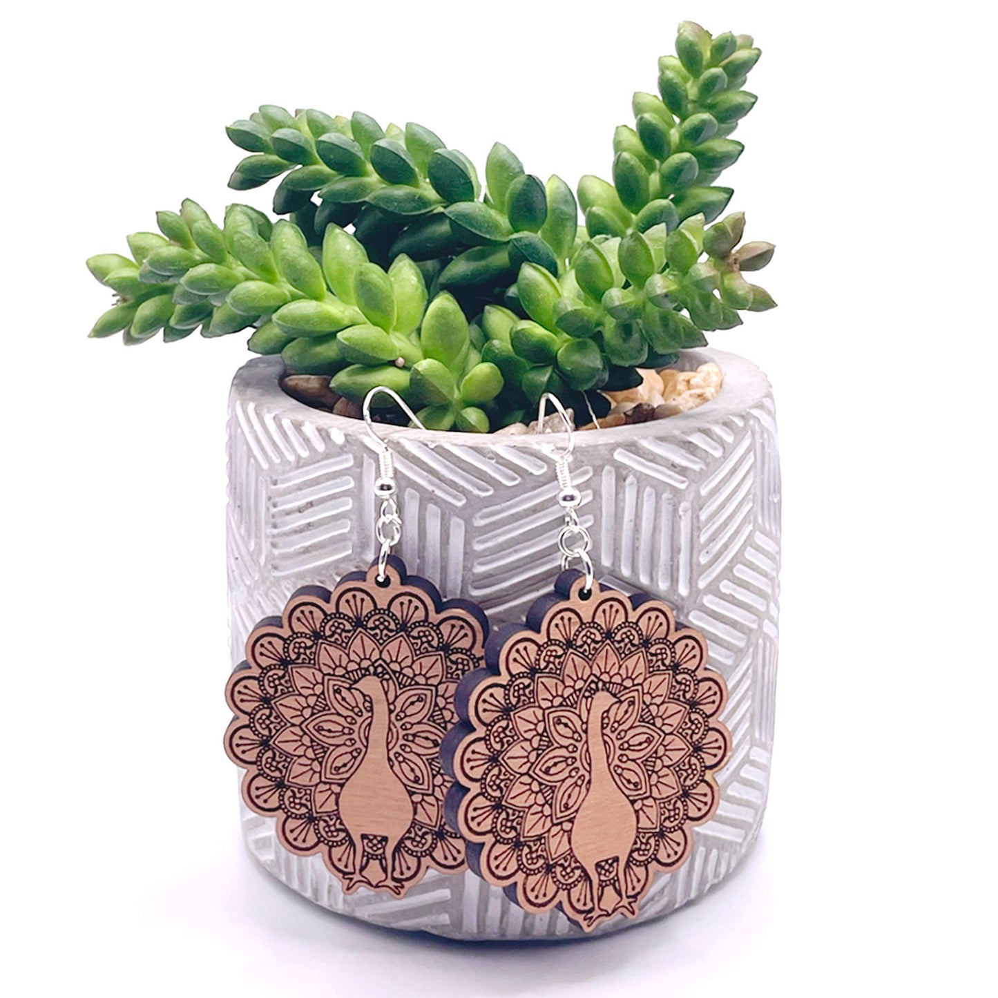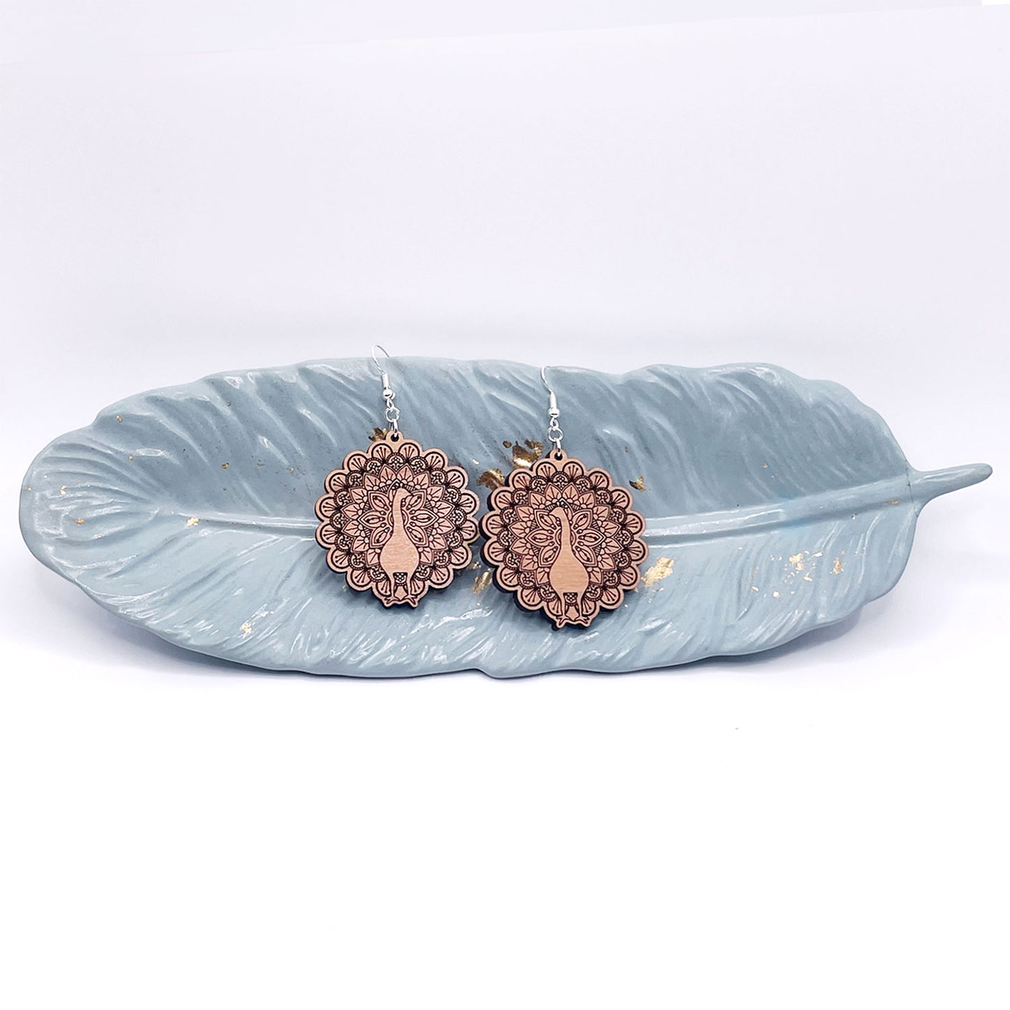 These cute peacock earrings, perfect for laser cutting, are beautiful in natural wood grain or painted. Includes two versions: An engraved Peacock body or an outline Peacock body.