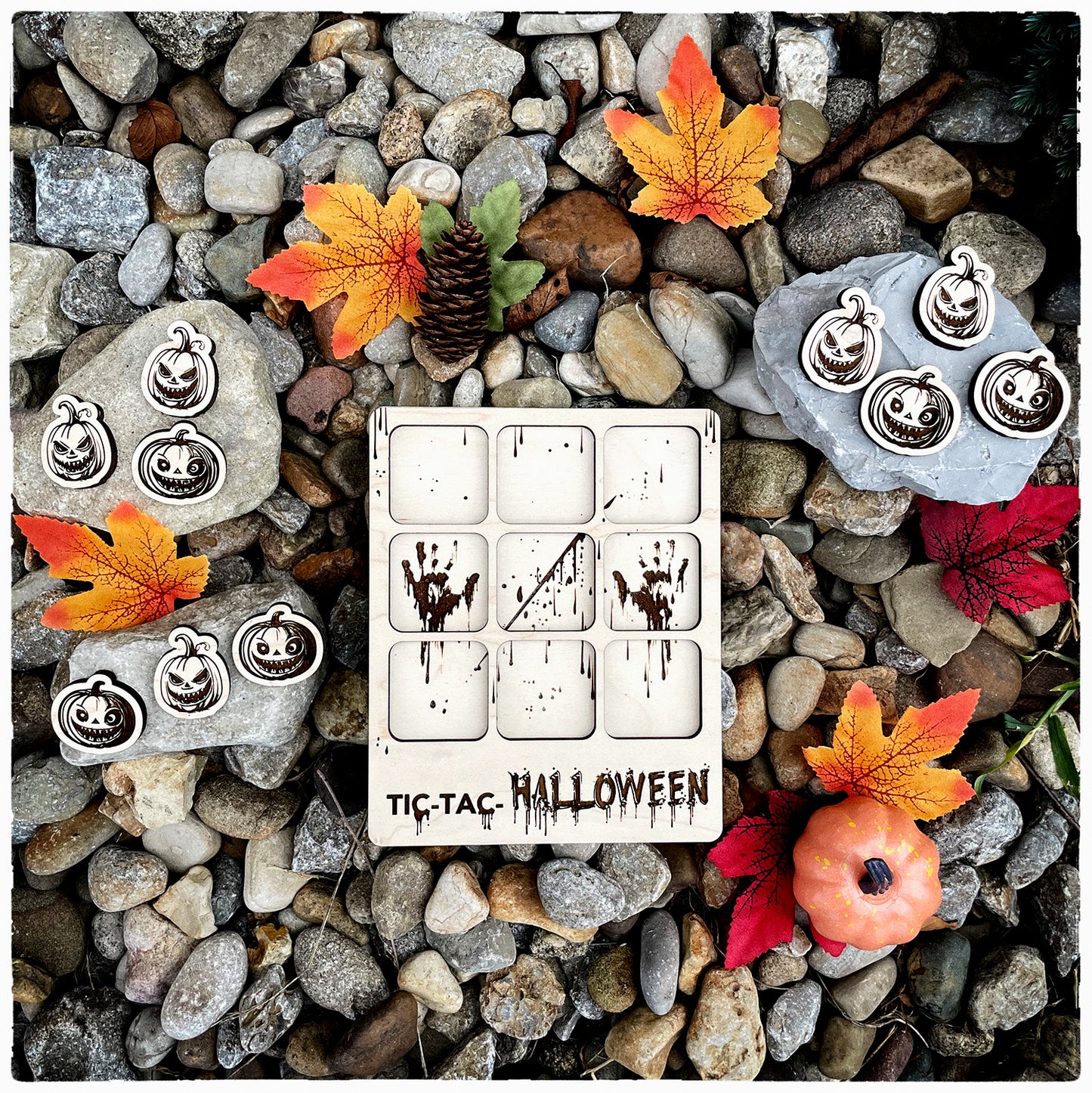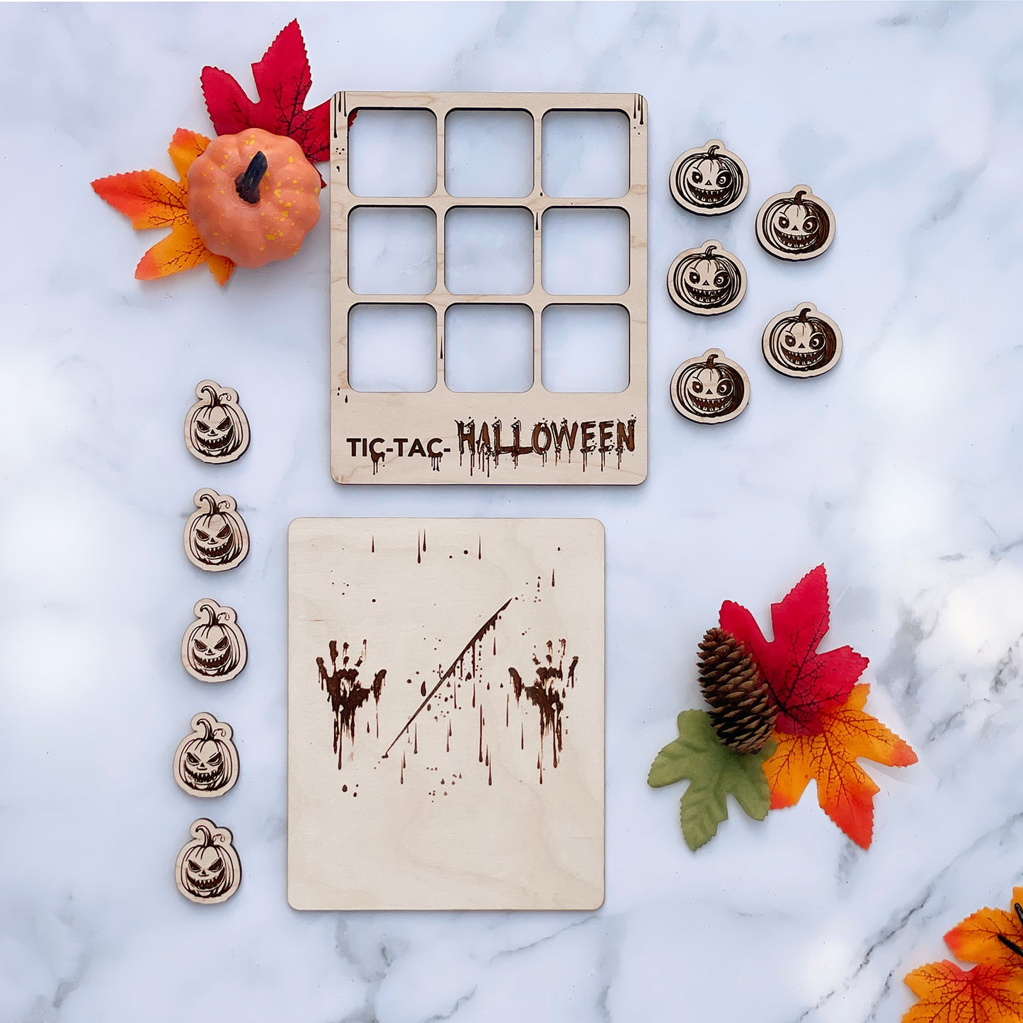 Presenting the Adult Halloween Tic Tac Toe Game - Spooky Tic Tac Toe for Grown-Ups, designed for laser cutting. Unleash your inner tactician with our Adult Halloween Tic Tac Toe Game - Spooky Tic Tac Toe for Grown-Ups, where spine-chilling fun meets strategic gameplay. This is no child's play – it's a laser cut game night experience designed exclusively for adults who revel in the darker side of Halloween. The intricate details of a mysterious bloody handprint and spooky jack-o-lantern game pieces set the stage for an intense battle of wits. Ample space is left for personalization of the customer's name or your Halloween party hostess.