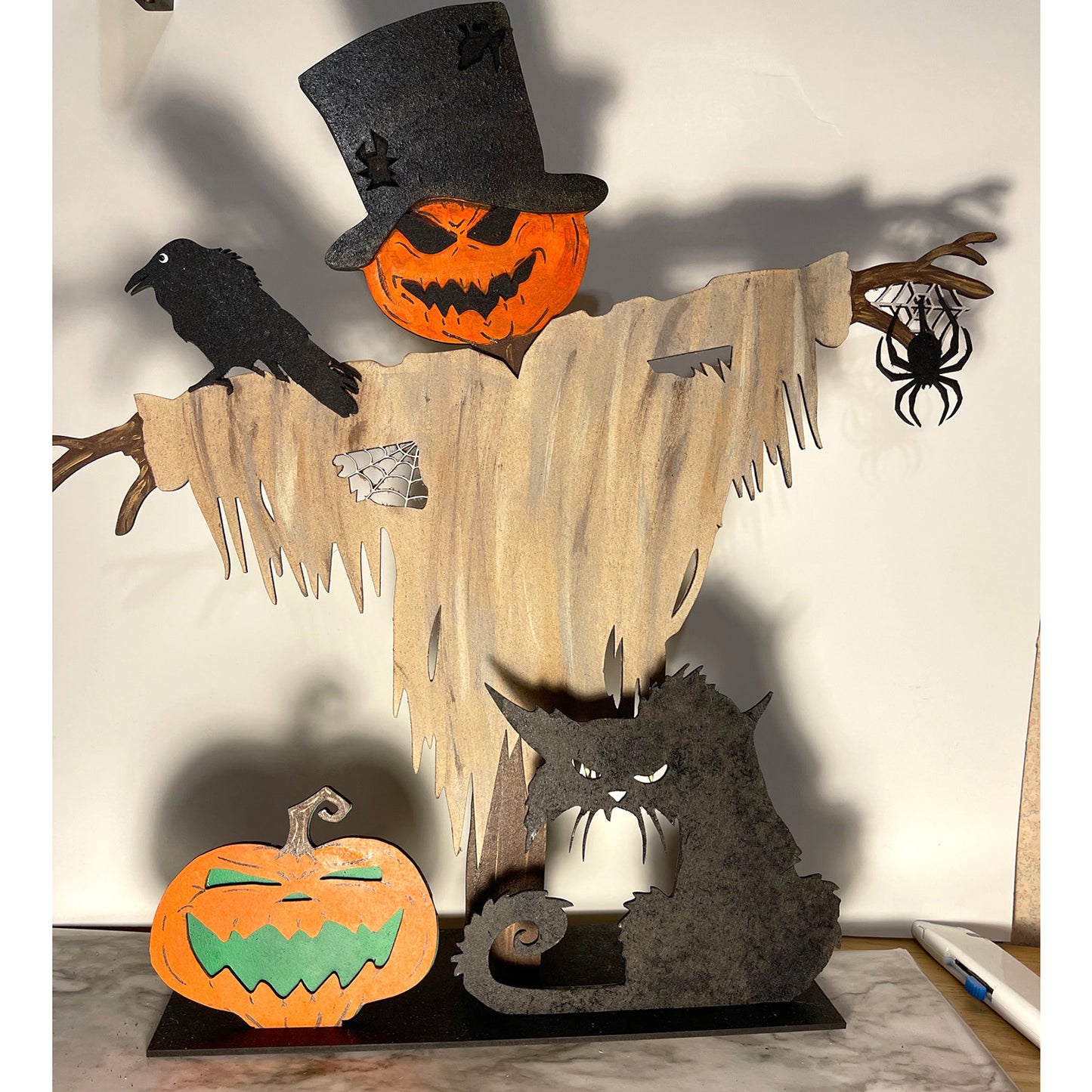 This laser cut Halloween scarecrow is a great addition to your Halloween decor. This design takes 16 minutes to cut and about 25 minutes to paint, making it a quick and easy decor idea. You can even add your own text and make it unique or drop the stand and hang it as a door hanger.