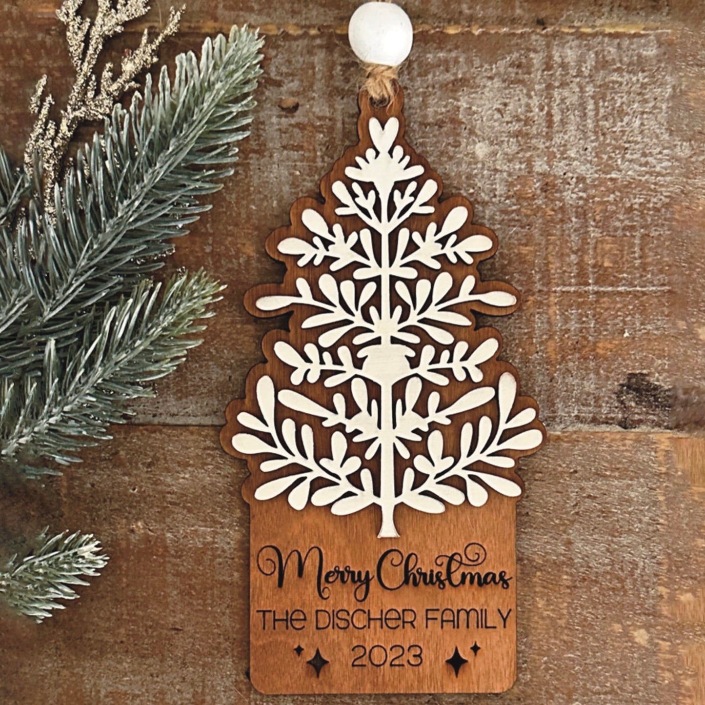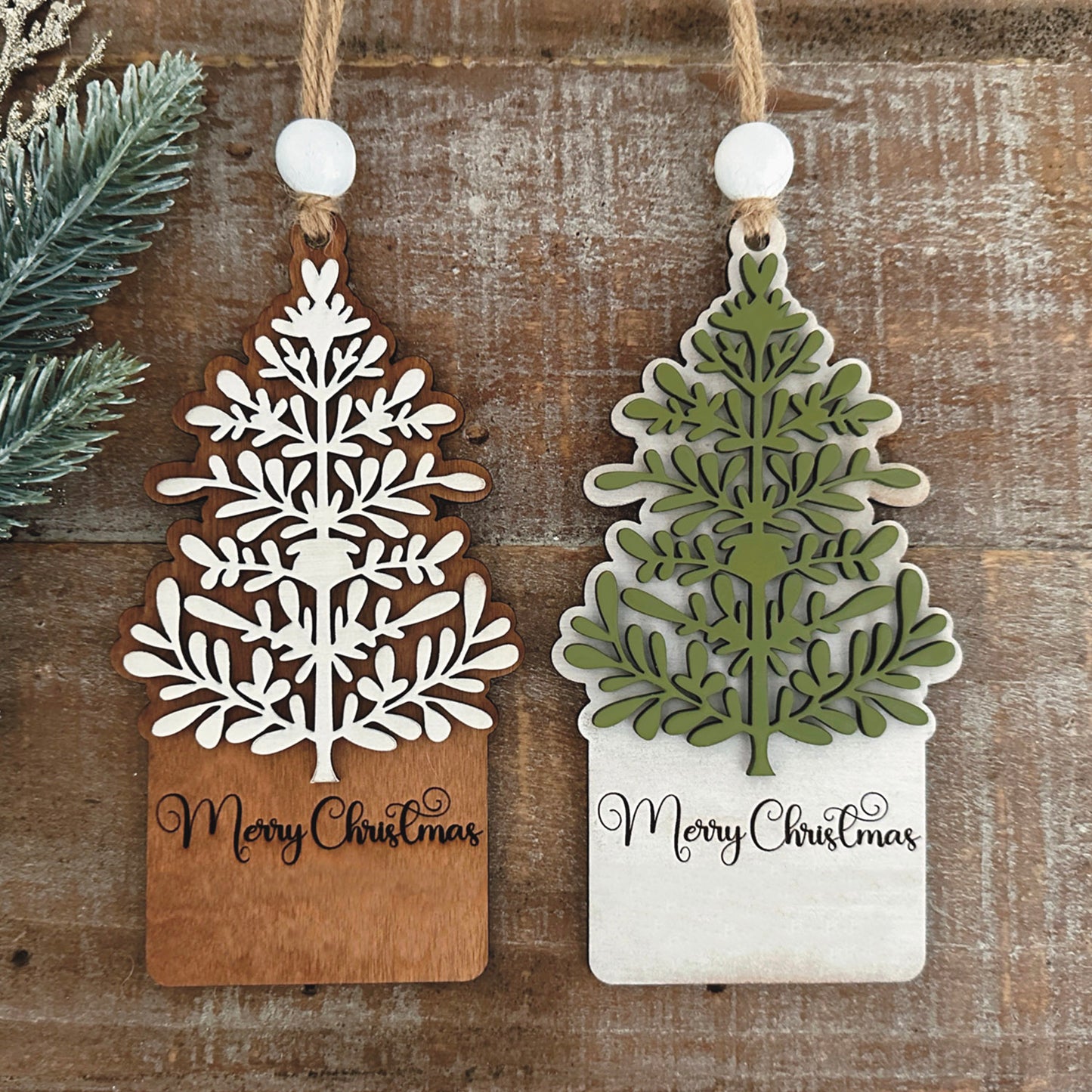 This layered tree design is hand drawn and so easy to laser cut, paint, and assemble for a quick, beautiful ornament that you can personalize.