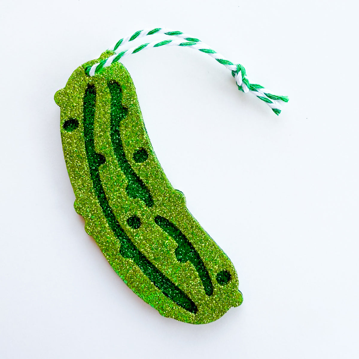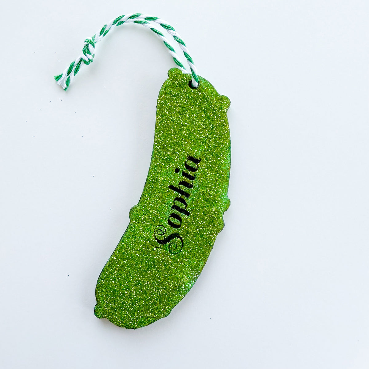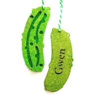 Personalized Pickle Ornament. A slight twist to the Christmas Pickle Tradition. Make a personalized pickle for each child in your home and when they find their own pickle, they receive a special gift or treat on Christmas Day. To make this design simply add your child's name, print, paint, glue, add glitter and thread some twine to hang. Merry Christmas!
