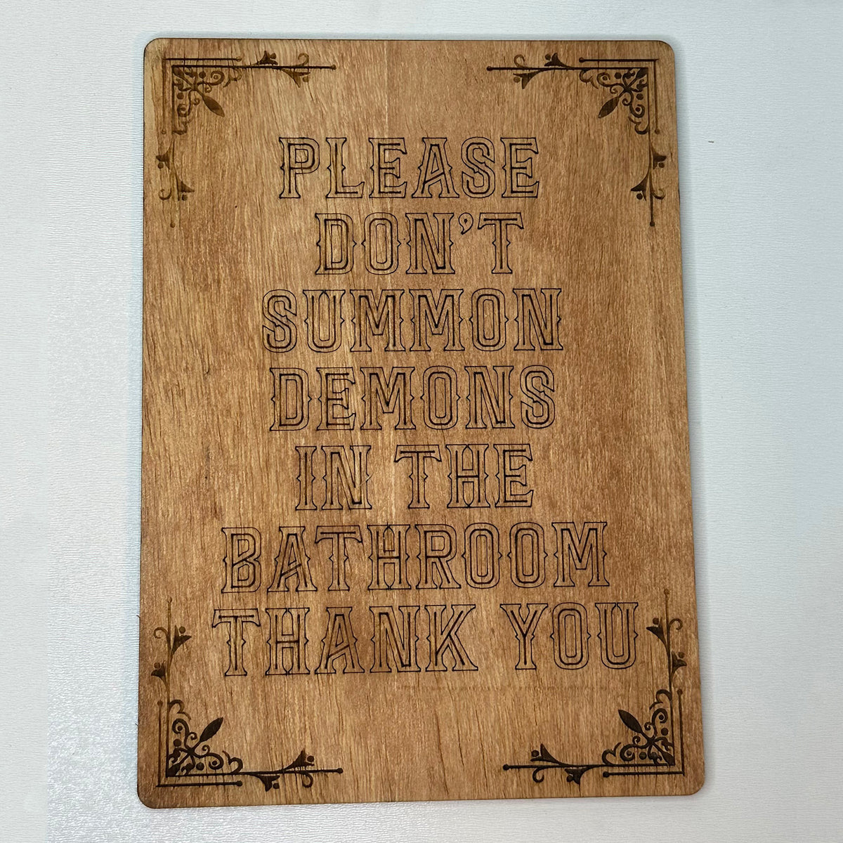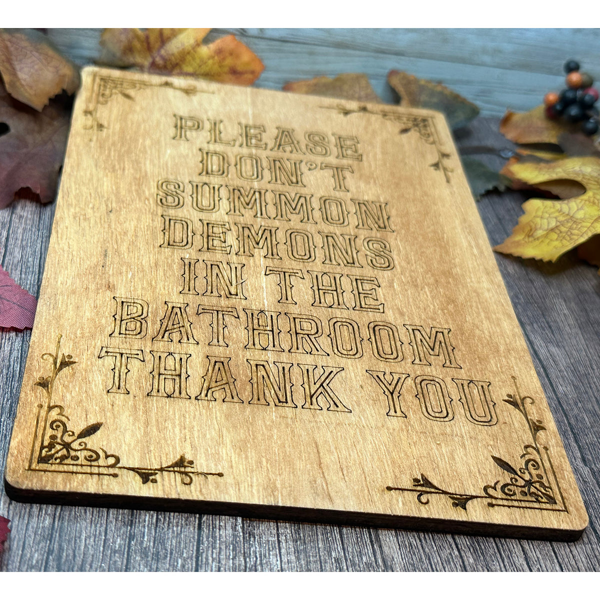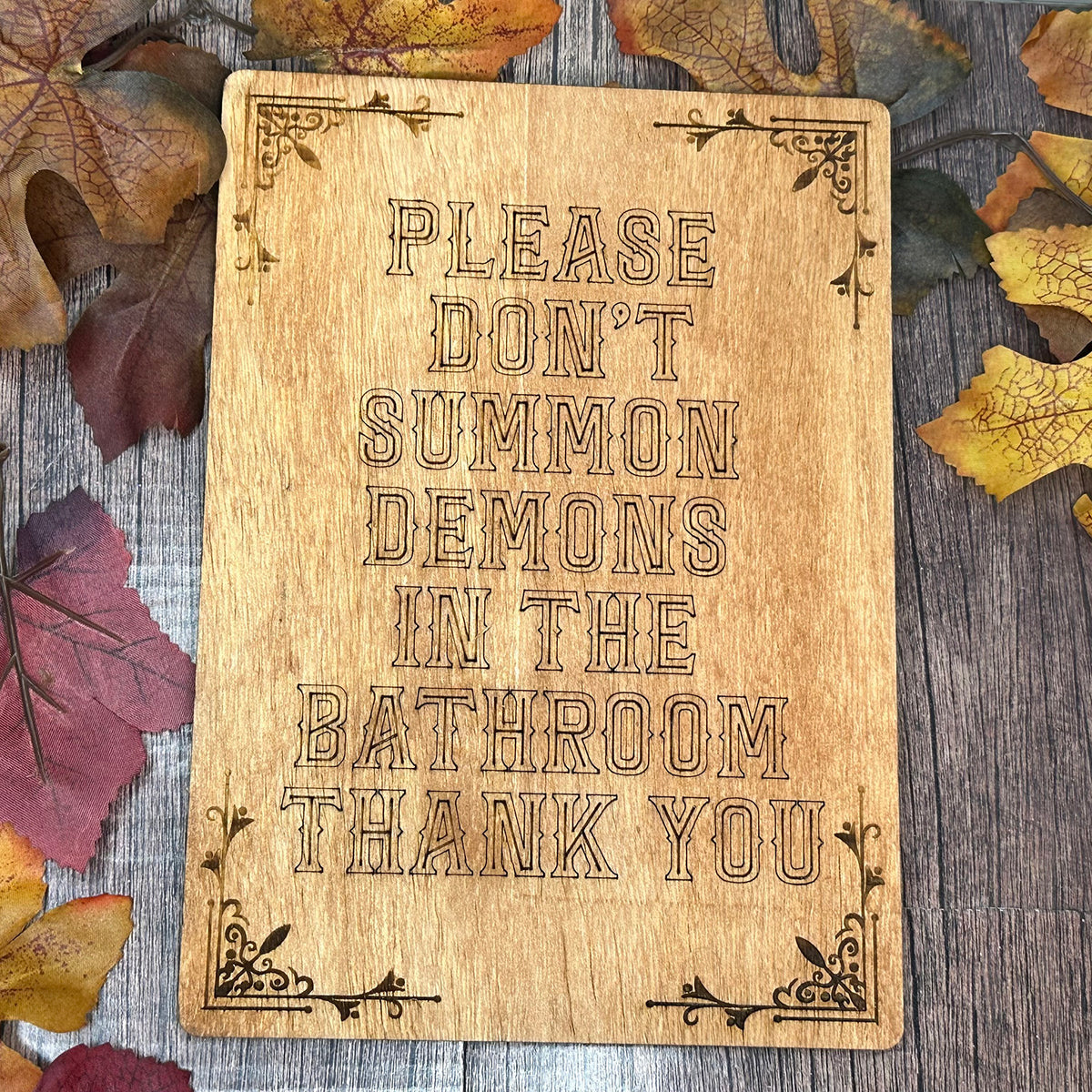 Keep things light and spooky with this hilarious "Please Don't Summon Demons in the Bathroom" sign. A perfect addition to your Halloween decor for a touch of mischievous fun.