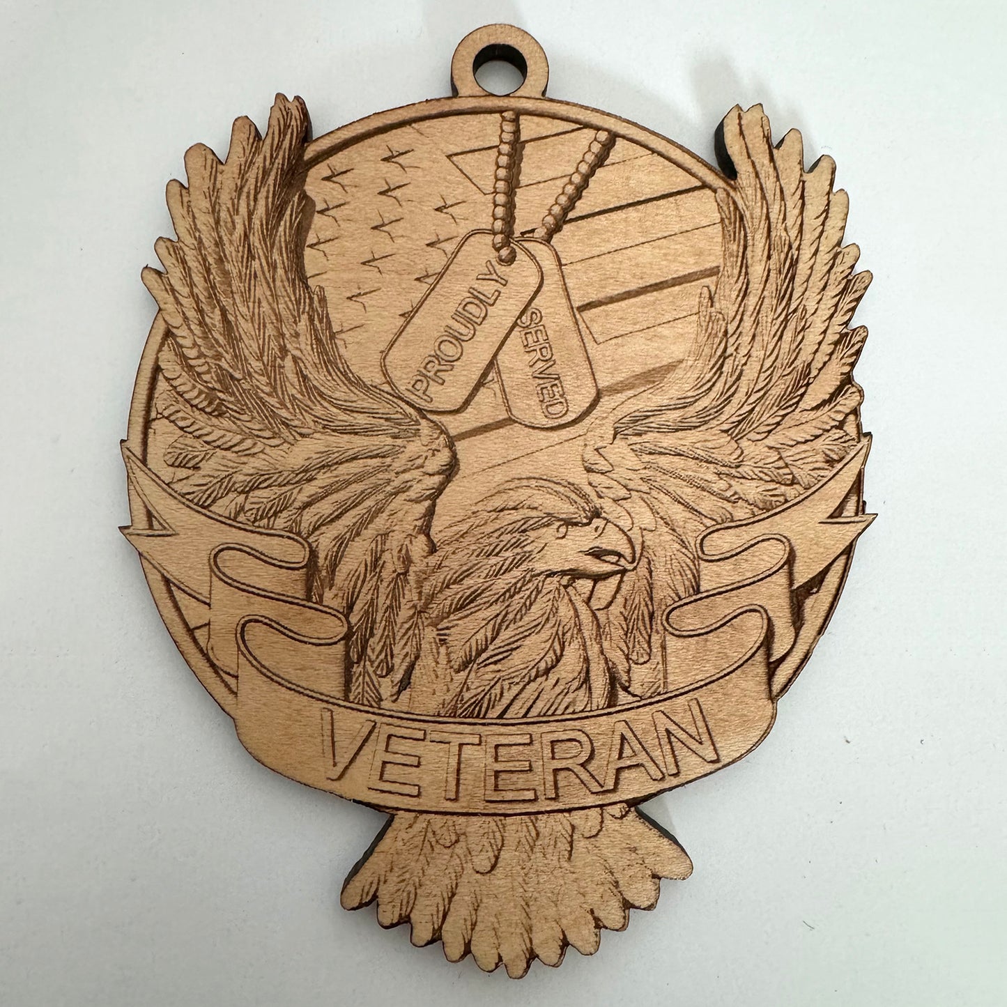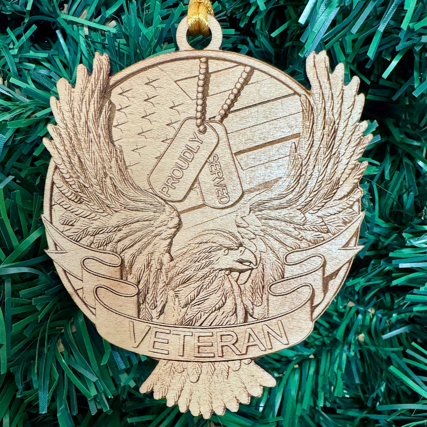 Holiday ornament celebrating the Veteran with an eagle over the American flag. Above the eagle are dog tags with Proudly Served. The Ornament is approximately 4" in wide, sample shown is engraved on maple. File works with Glowforge, Aura, Spark with appropriate materials. I typically use Medium Maple Proofgrade. The 3D look is an illusion with the ornament nearly smooth to the touch, It's done by using Vary Power to make areas lighter or darker.