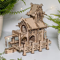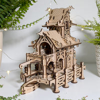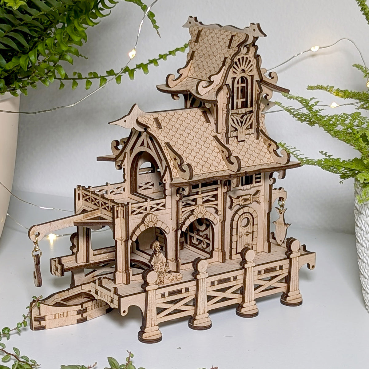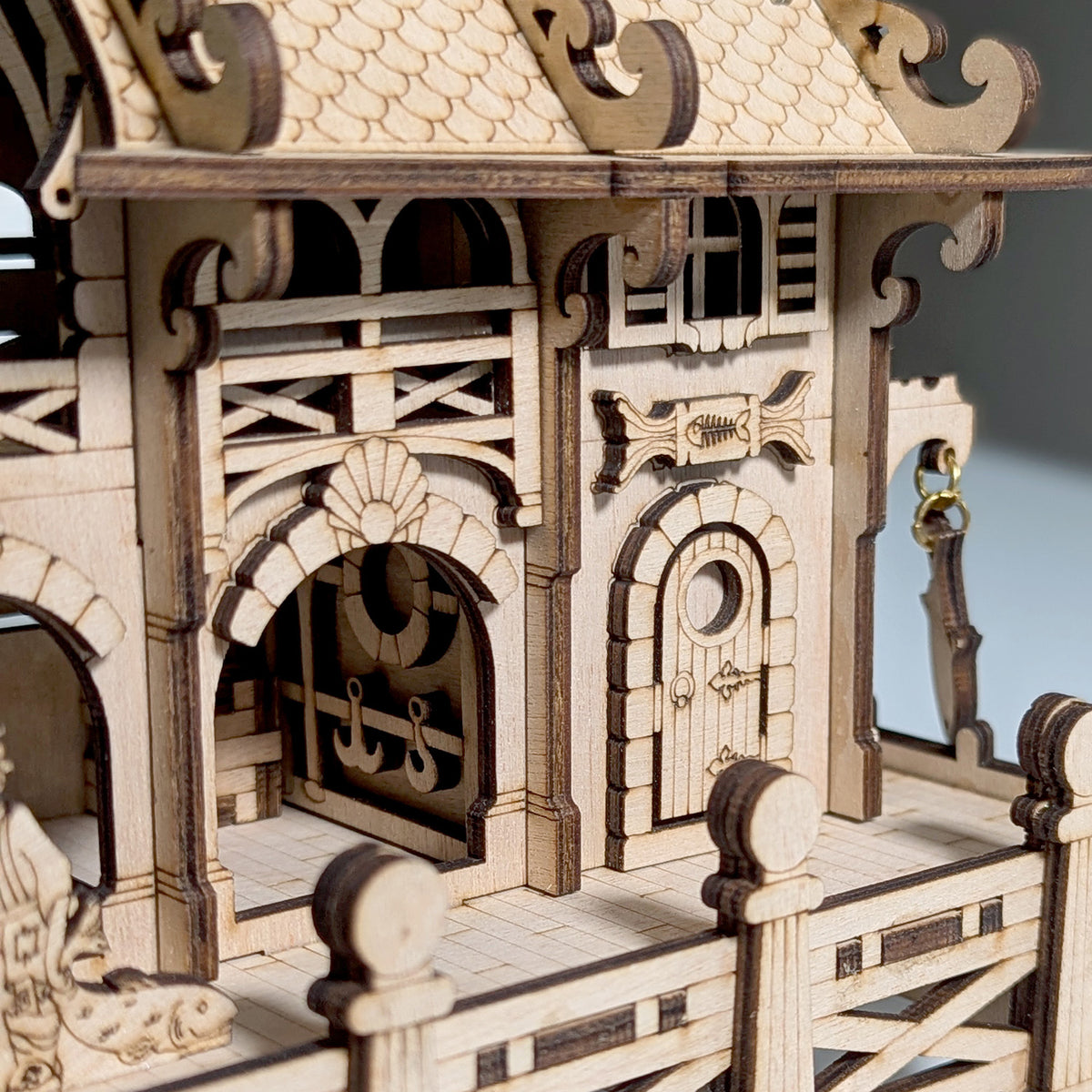 A charming sailor's house model, perched by the sea. A small boat rests at its dock, while a mermaid atop the roof keeps watch over the ocean. The model is adorned with nautical details, creating a peaceful and picturesque coastal scene.