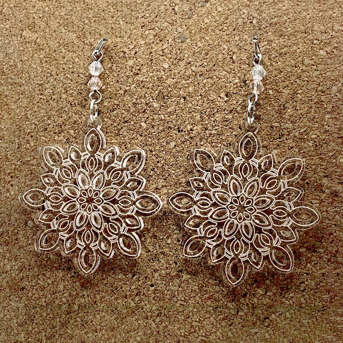 I made these with silver mirror and cut on the mirror side. Rather than cut it all I scored the design and only cut the outside. I add a hole for the earring hoop. My friends raved over them.