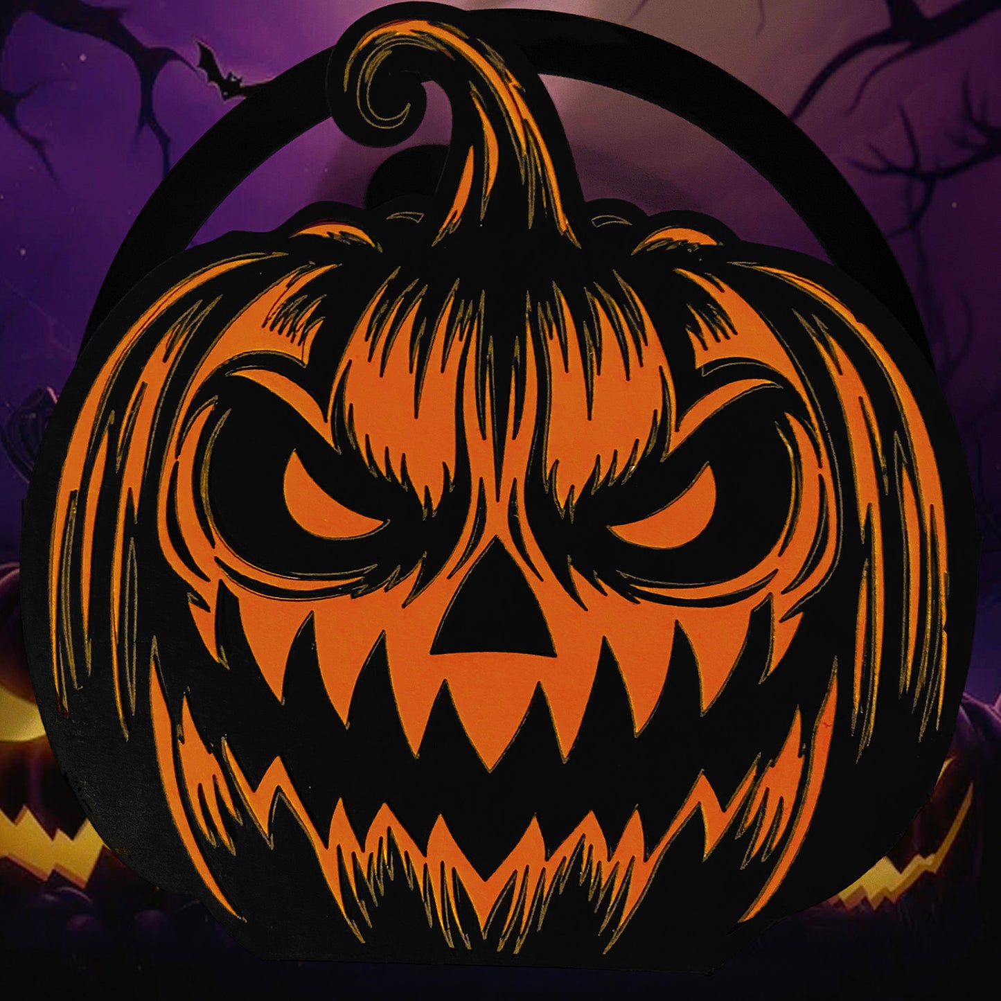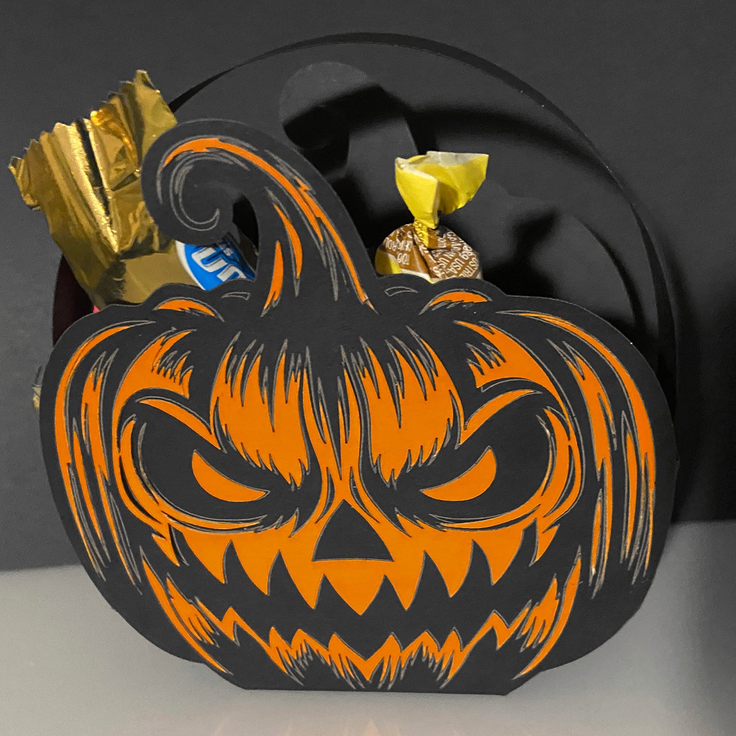 Whether candy hunting or gifting, this haunting pumpkin design crafted from durable cardstock offers a spooktacular way to carry your Halloween stash.