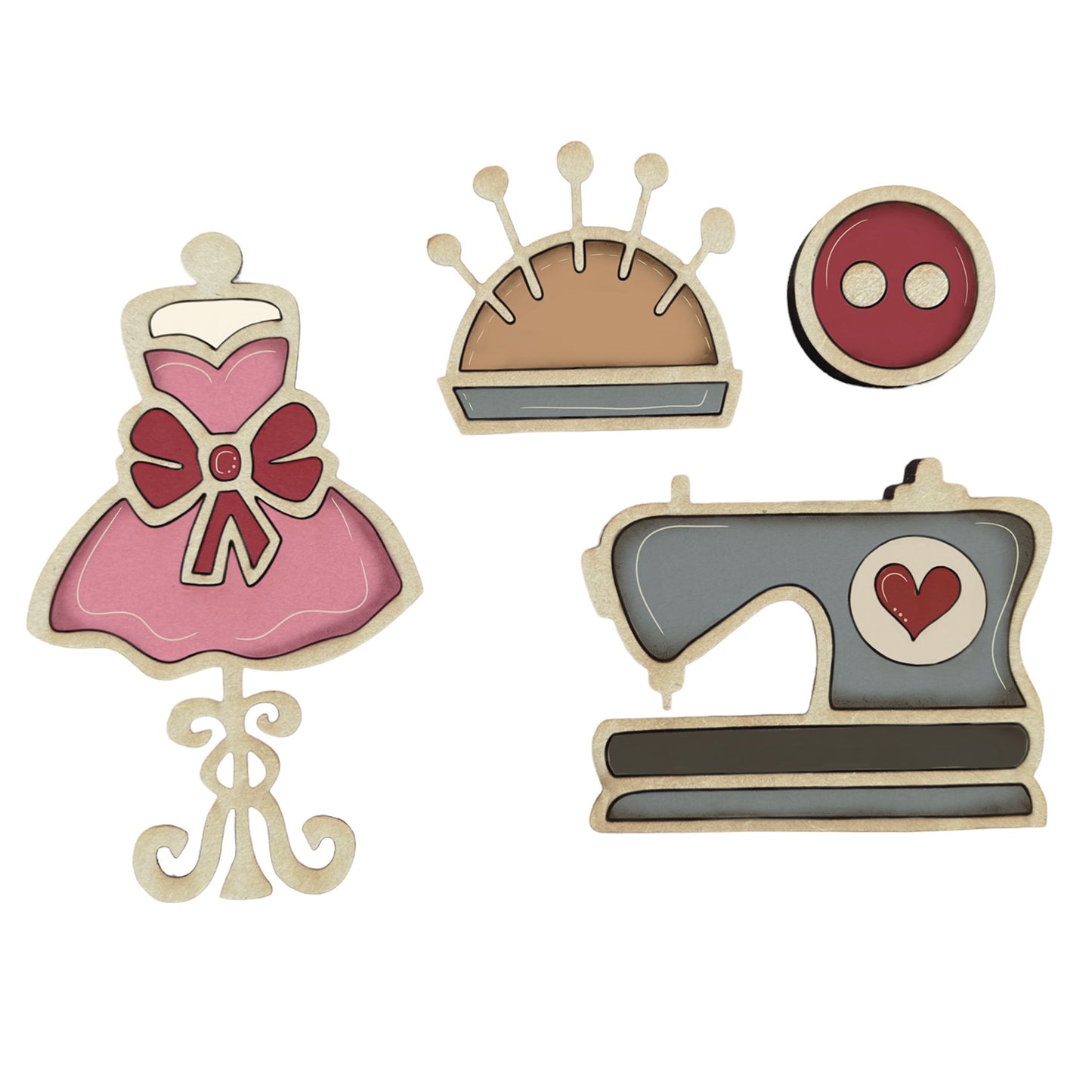 This whimsical, laser cut, sewing-themed magnet collection comes with four elements (sewing machine, pincushion, button and dress form), and can be created using papers/fabrics on the inset pieces (full instructions included) or simply painted, the choice is yours. Each magnet is double layered (top graphic layer and bottom backing piece), making it a solid 1/4" piece when assembled.