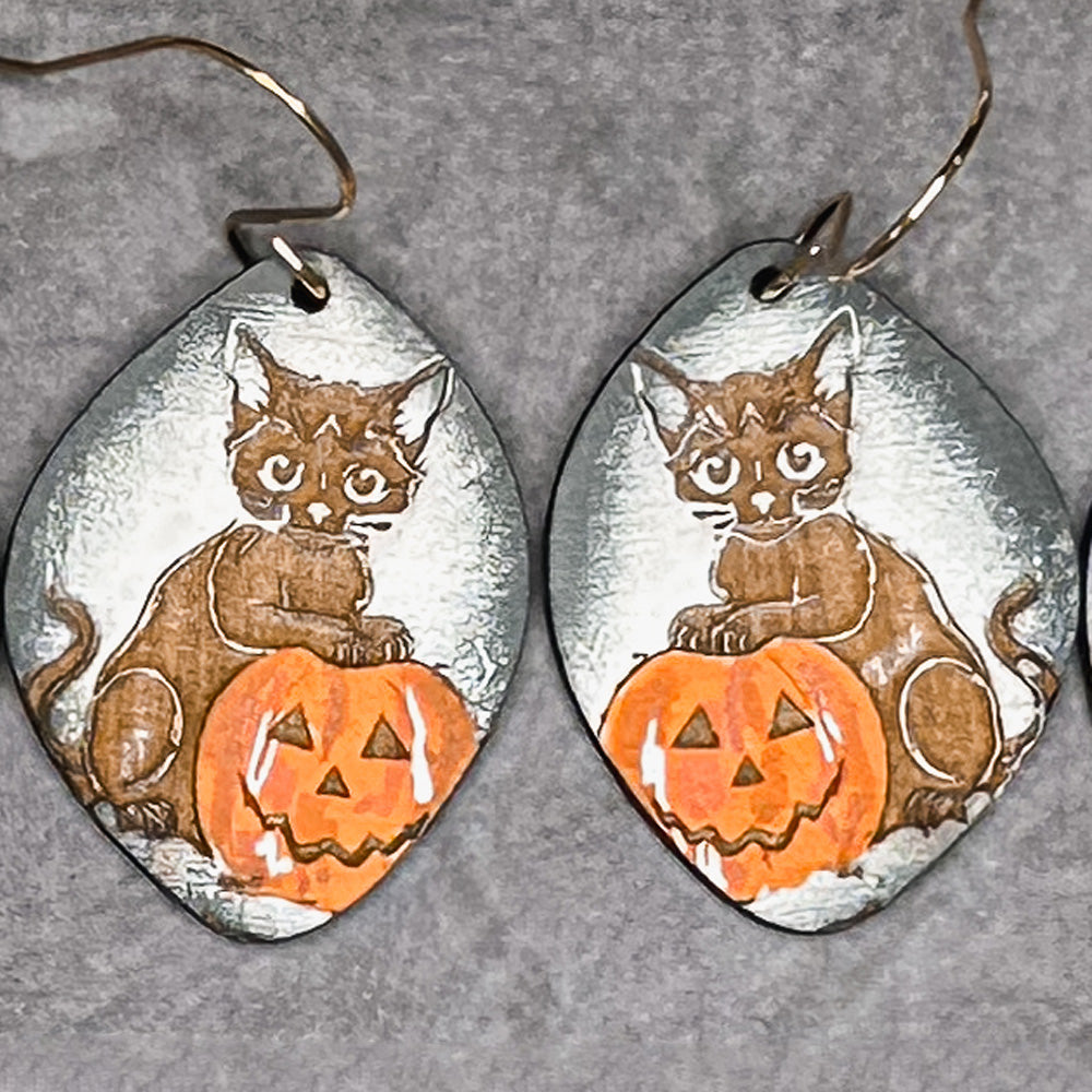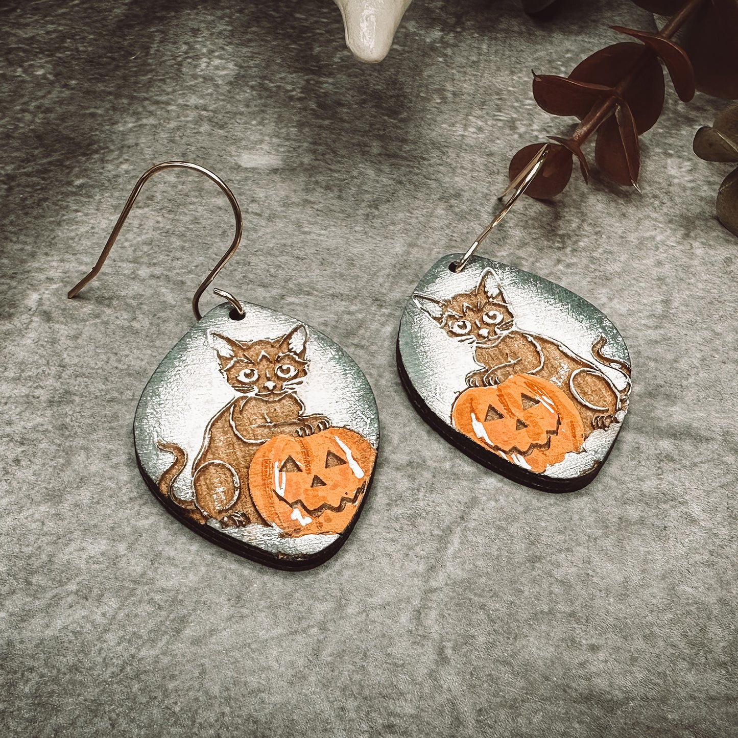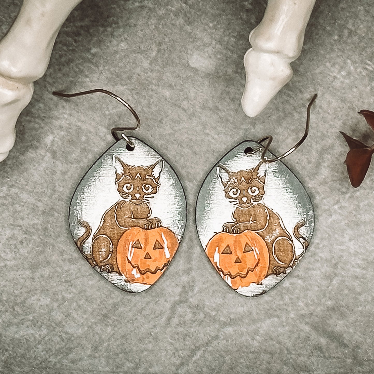 Spooky Halloween Cat with Jack-O'-Lantern Earrings