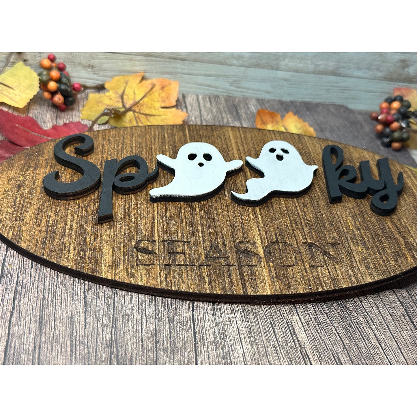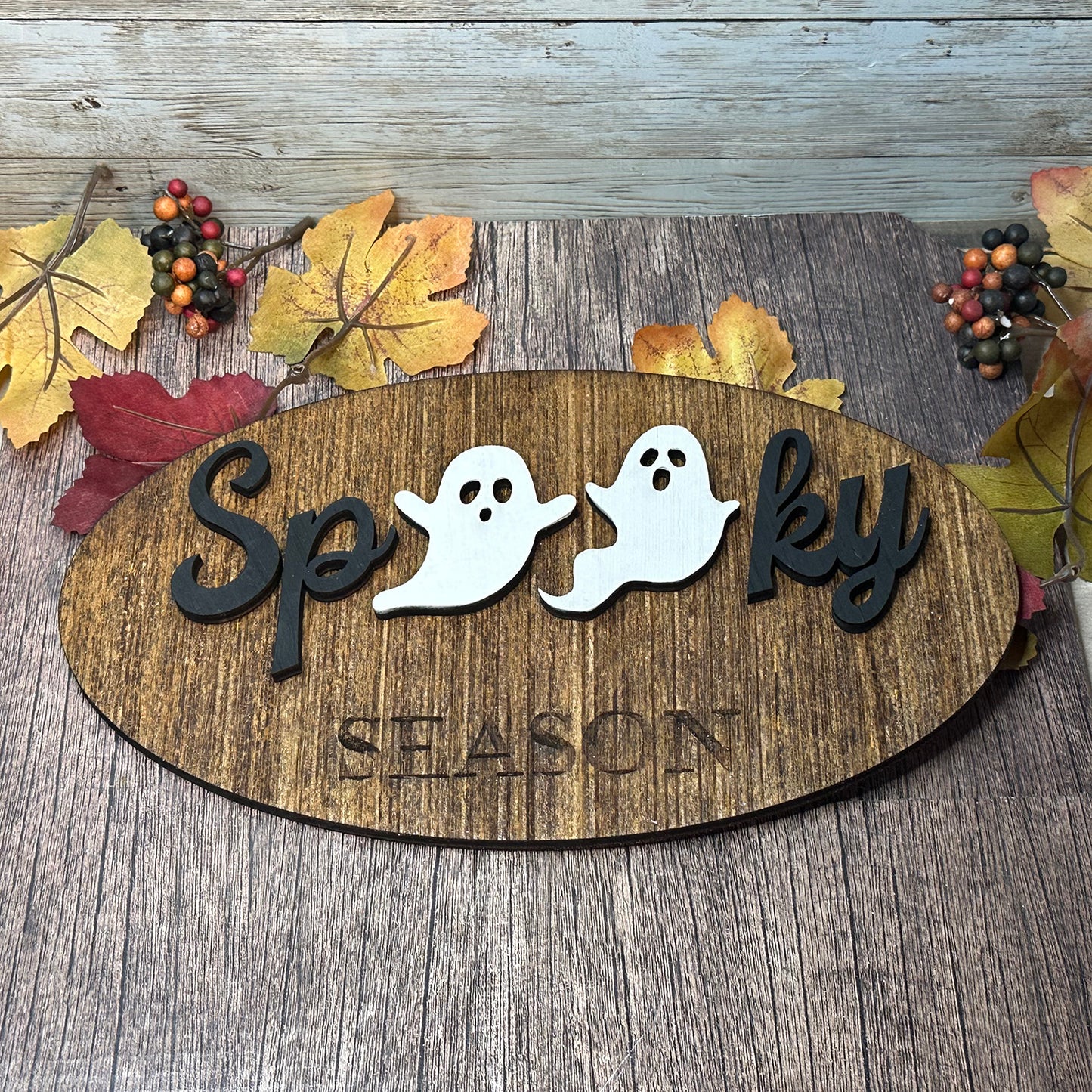 Add a ghostly touch to your Halloween decorations with this "Spooky" sign, where the O's are playful ghosts. Perfect for hanging on doors or walls to enhance the eerie ambiance.