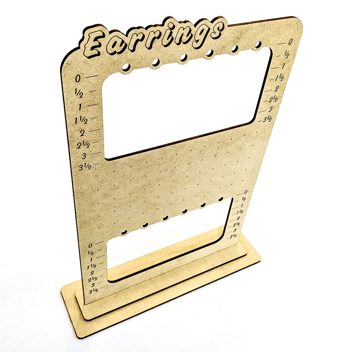 This beautiful laser cut earring display features two built-in dangling earring measurement guides up to 3.5" long and can hold six pairs of dangling earrings in the guided section and up to 30 pairs of stud earrings in the center section! Be the talk of the town with this gorgeous display.