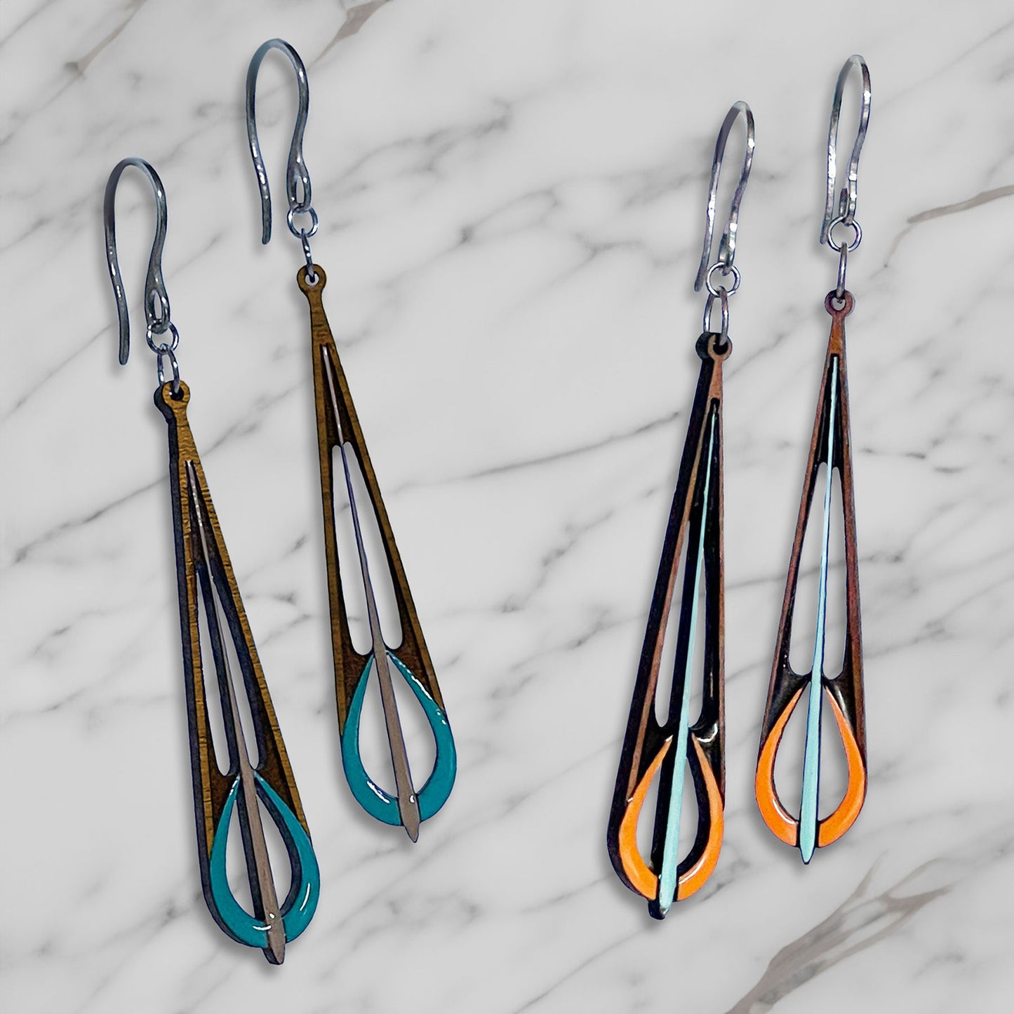 These striking earrings are perfect to personalize with a bit of color to suit any mood. Delicate laser cutting, engraving and scoring are combined with a modern drop design sure to turn heads.