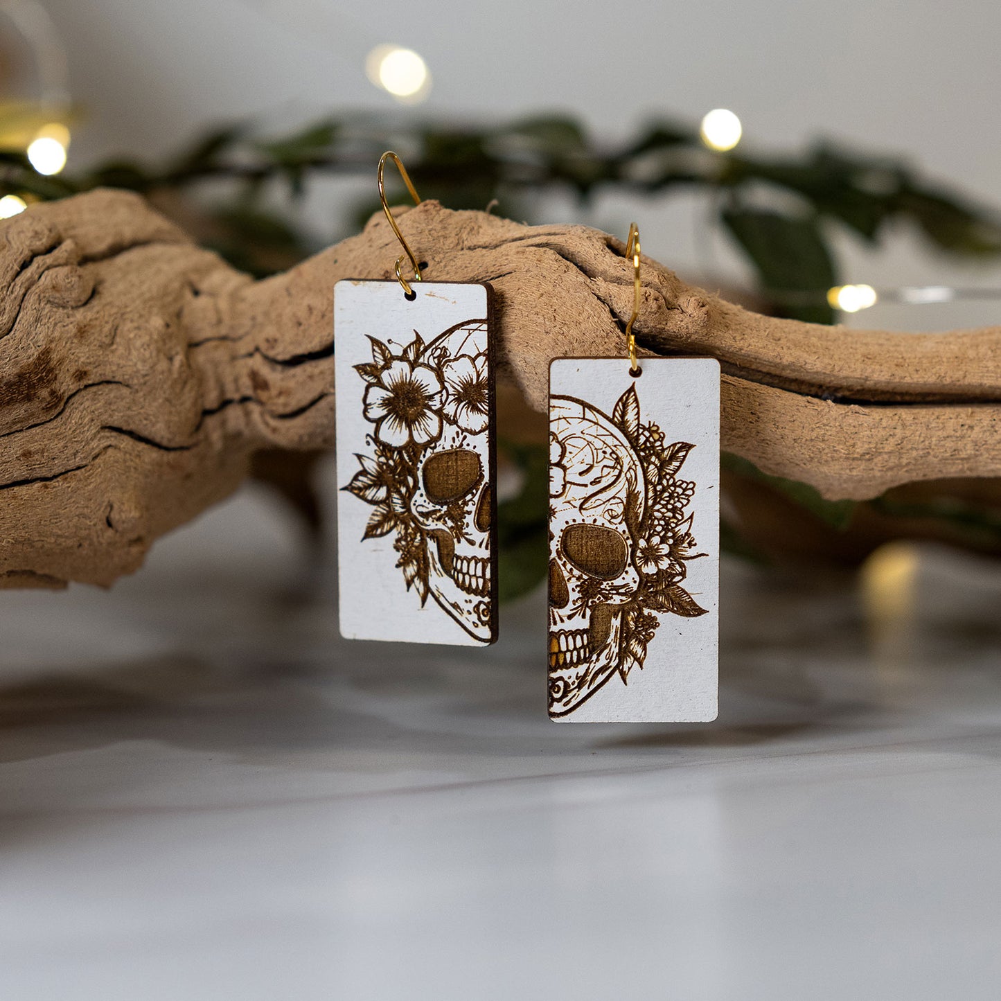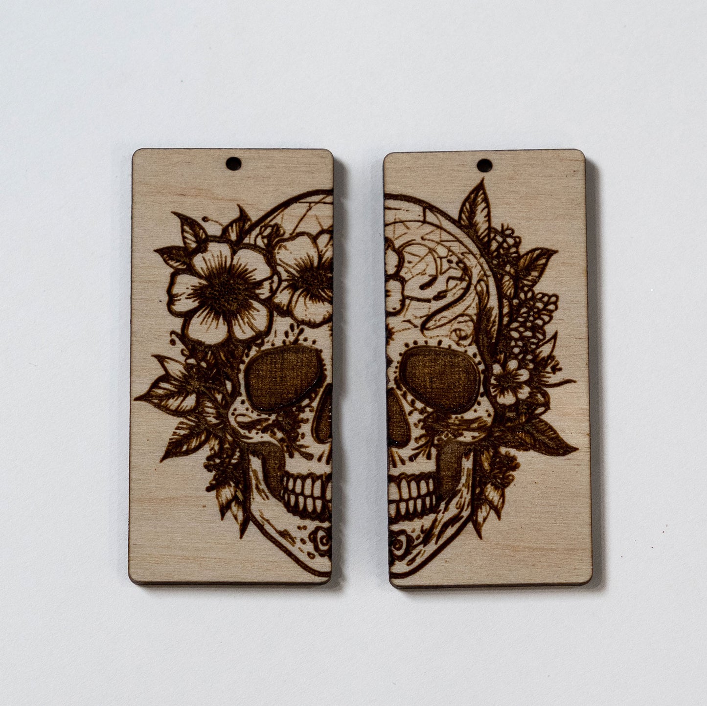 The rectangular shape can add a sleek and modern look to the design, while still showcasing the intricate details of the sugar skull and floral patterns. The earrings can be laser cut from materials such as wood depending on personal preference, and can be made in a variety of sizes to suit the wearer's style. With the rectangular shape, these earrings are sure to catch the eye and make a statement with any outfit.