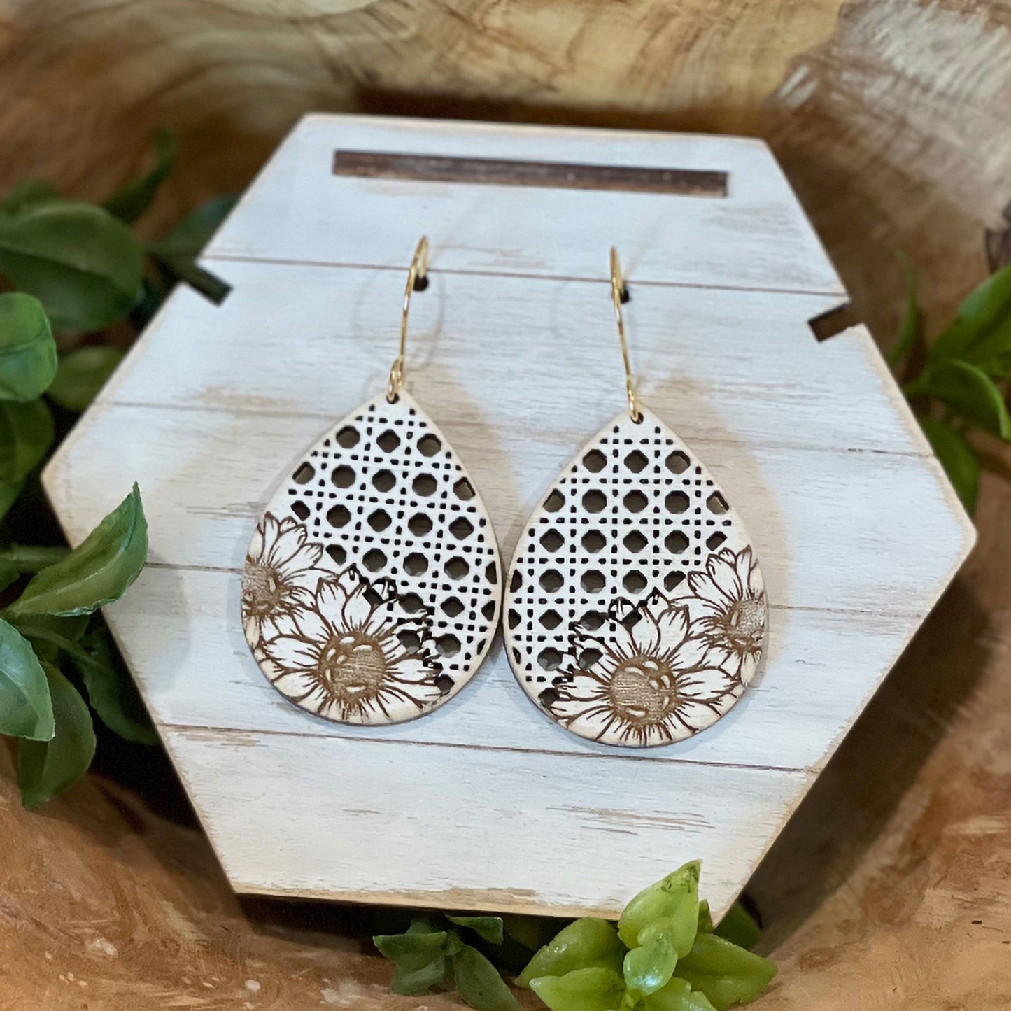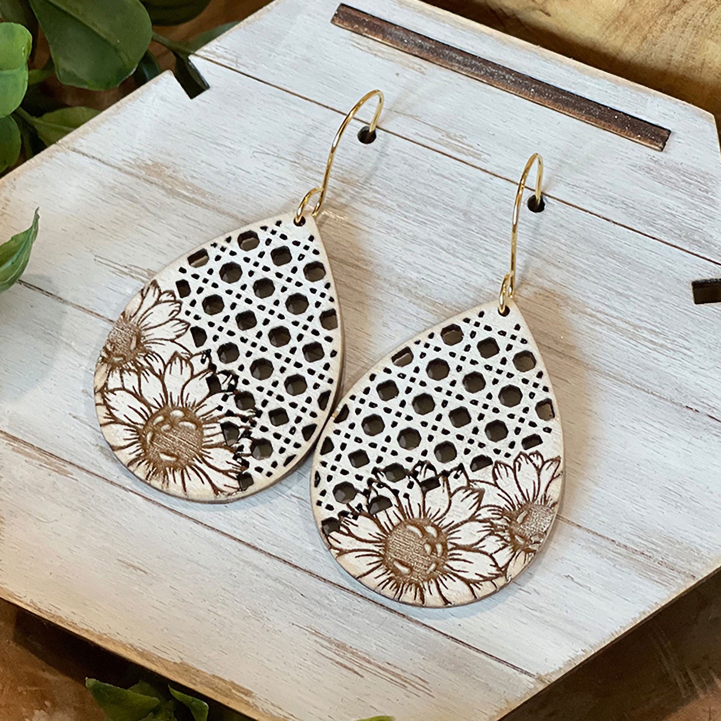 These minimalist, laser-cut Sunflower Rattan Drop Earrings are the perfect go-to accessory. The teardrop shape with rattan design adds a modern touch to your everyday look.