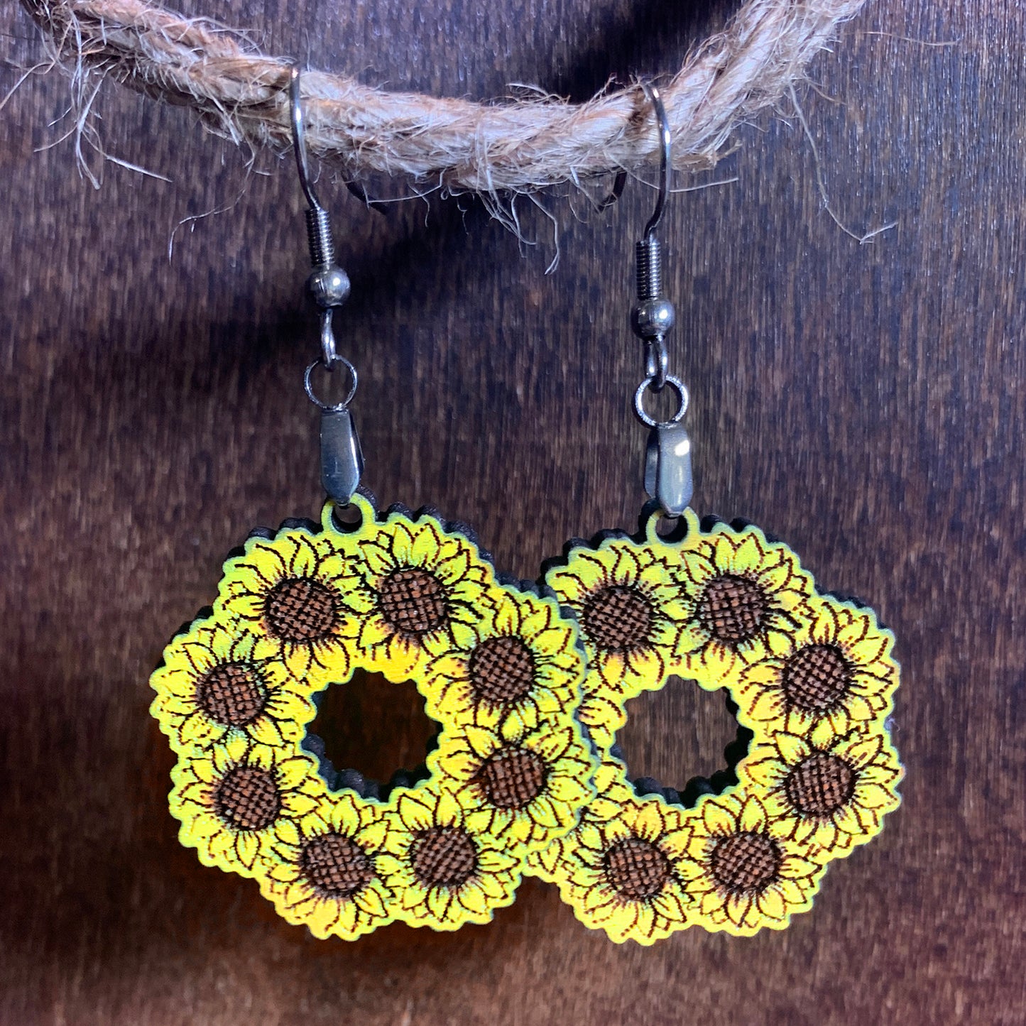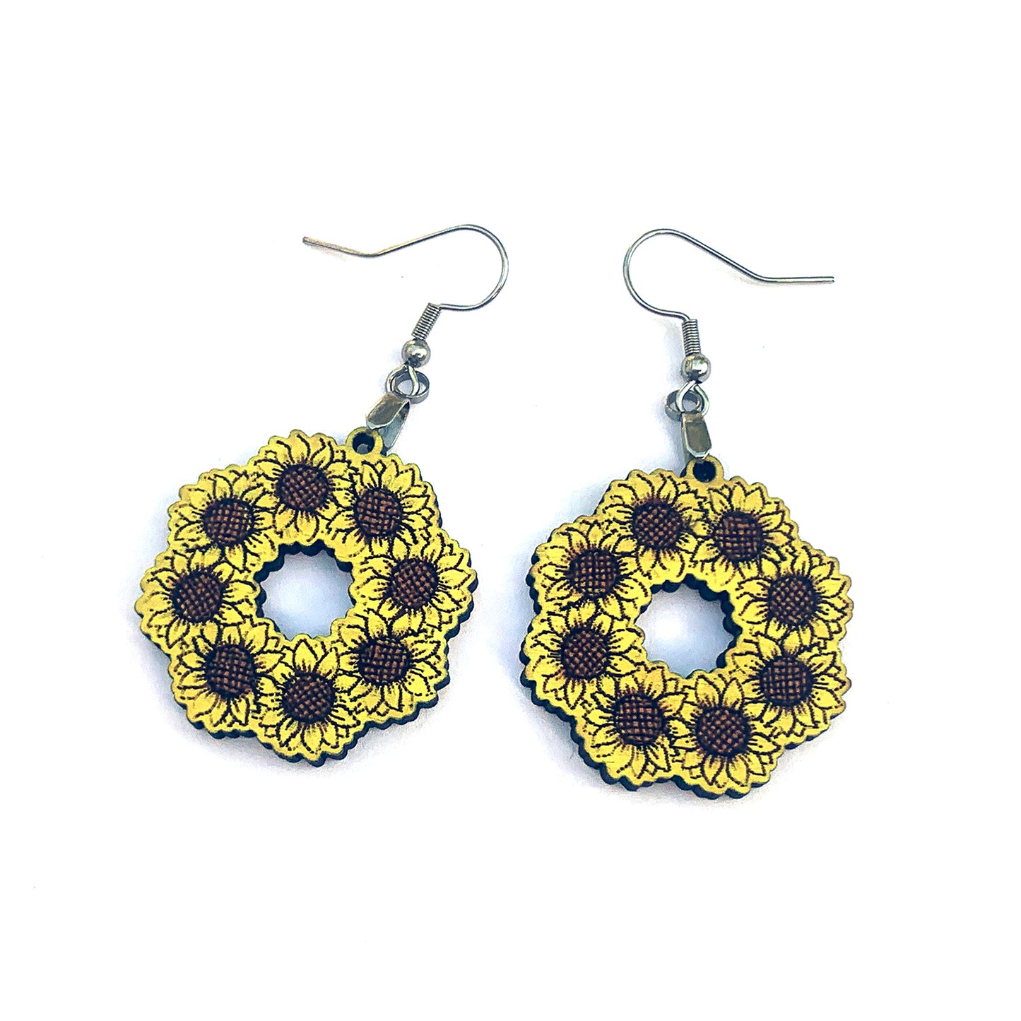 Add a blooming touch of nature to your style with these beautiful, laser cut Sunflower Wreath earrings. Delicate sunflower petals intertwined in a beautiful wreath design. These earrings exude warm and vibrant energy, perfect for brightening up any fall outfit.