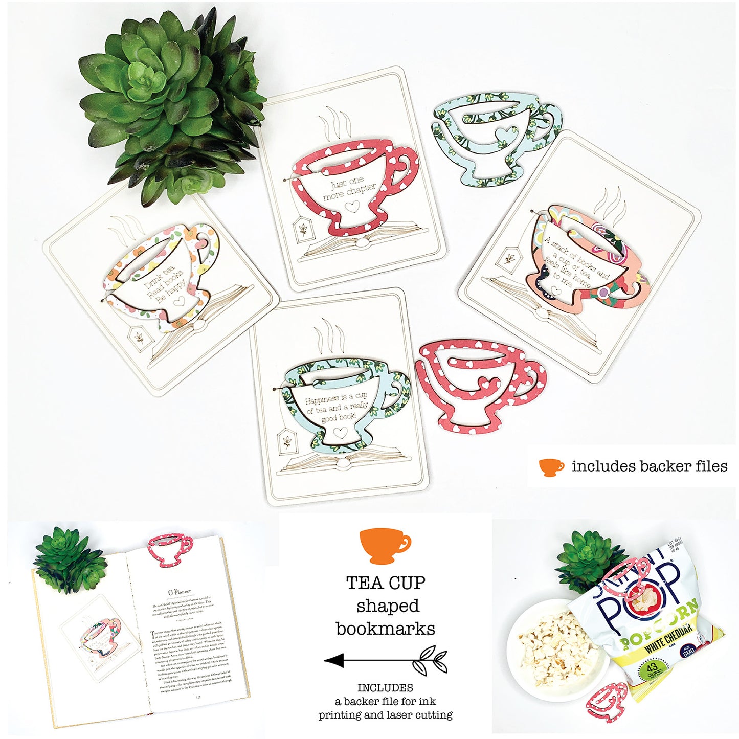 Tea Cup bookmark laser cut file. These are great book-lover gifts. Includes backer files that can be scored and cut on the laser on poster board using the 20 lb copy paper Glowforge setting. These make great scrapbusters! Slide them into a self-sealing cellophane bag and you've got a great little add-on product that sells well at markets, bookstores, or as a promo gift. To create a patterned look, Mod Podge scrapbook paper to 1/8" wood, let dry, mask with low tack masking tape, and cut.