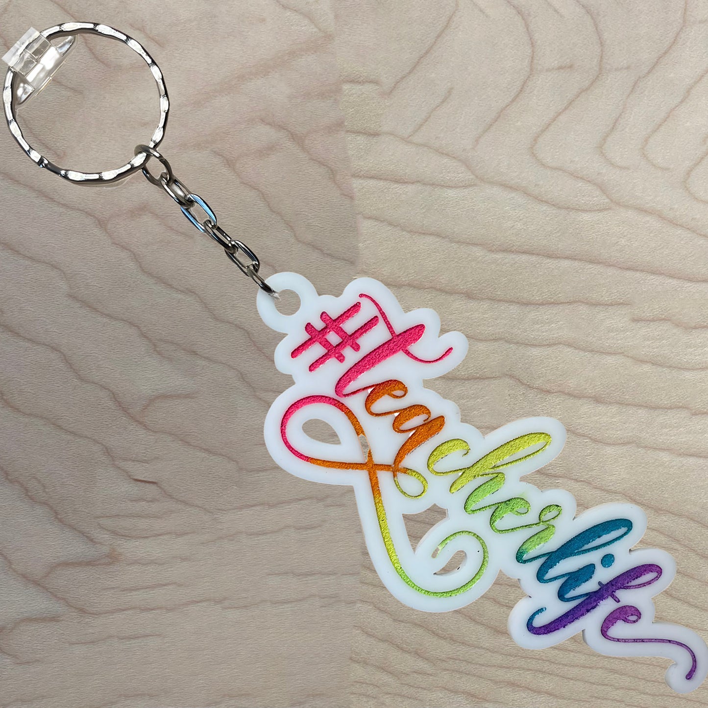 Cute and fun to make, these teacher-inspired keychains are perfect for laser cutting. Quick and easy, they make great gifts for teachers. You can use wood or draft board, but I preferred to engrave white acrylic and do a paint fill. It really helps to make them stand out.