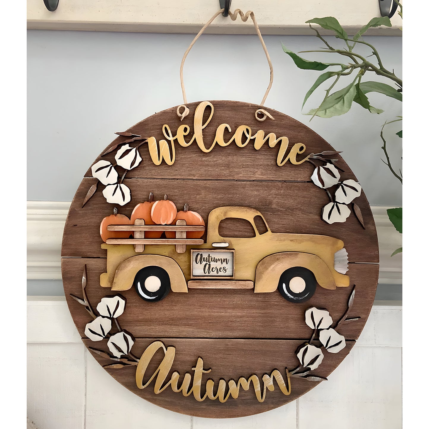 Welcome Autumn Pumpkin Delivery Truck 15" Door Hanger Sign