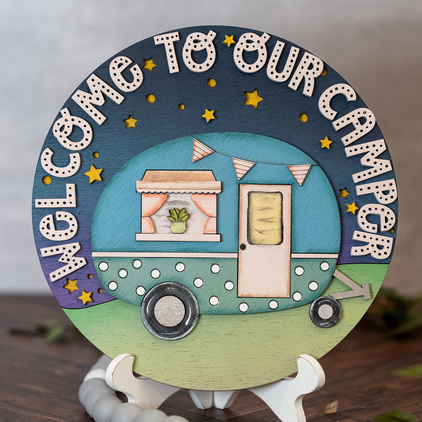 The "Welcome to Our Camper" laser cut file features a vintage camper set against a backdrop of a starry sky. The design is intended to evoke a sense of nostalgia and adventure associated with camping and the camper lifestyle. Check out other Diva Watts Designs here.