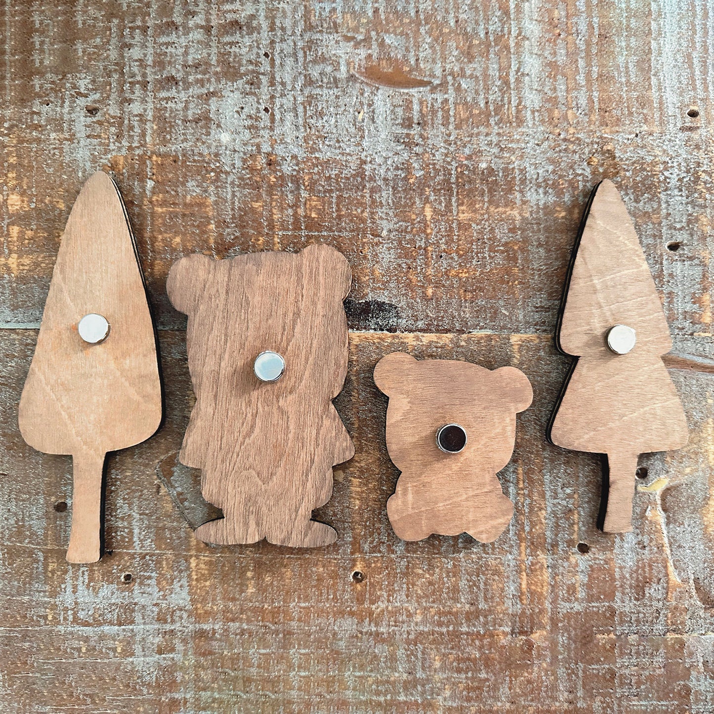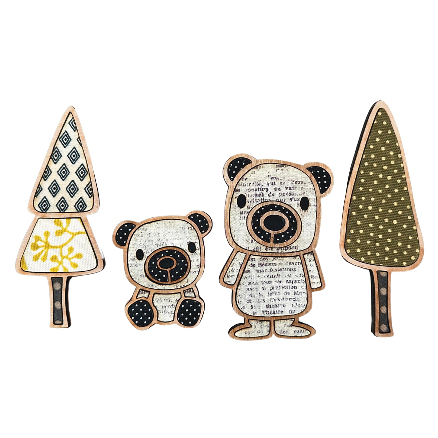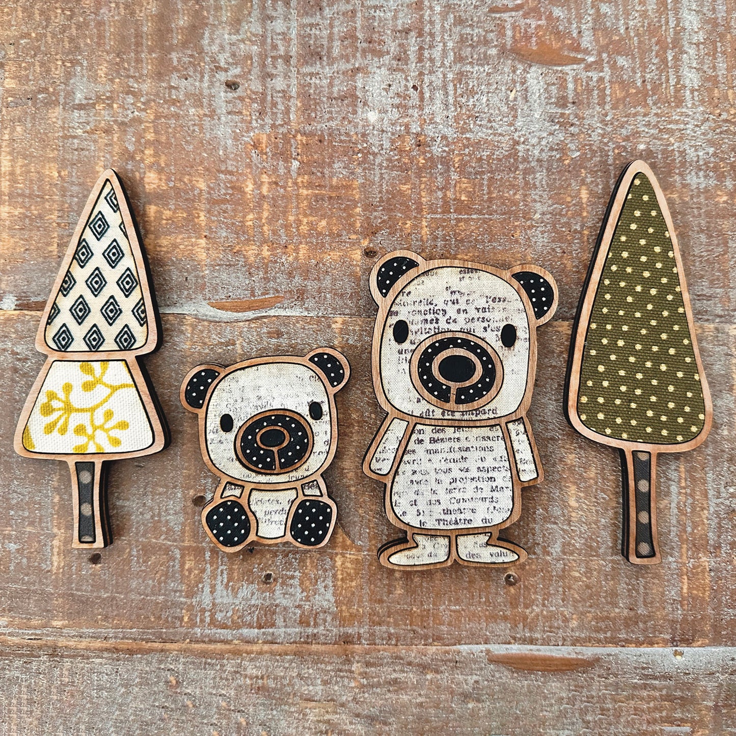 This set of hand-drawn, laser cut bear-themed magnets will add such a whimsical touch to your decor! They can be completed in different ways; finished with paper and/or fabric, as shown, or you can simply paint the inner pieces. You could also just use the top border layer attached to the base piece and not worry about the inner pieces at all. Instructions are included for the simple technique of using paper/fabric to use patterns on your laser cut magnets.