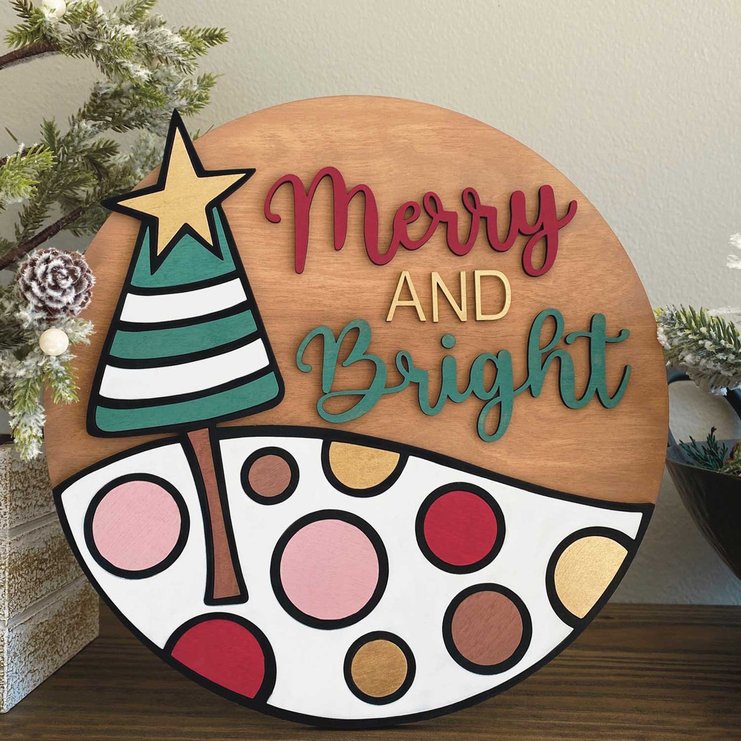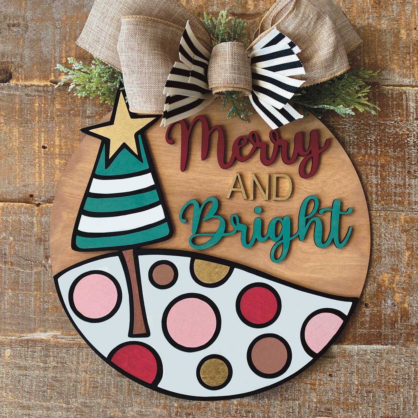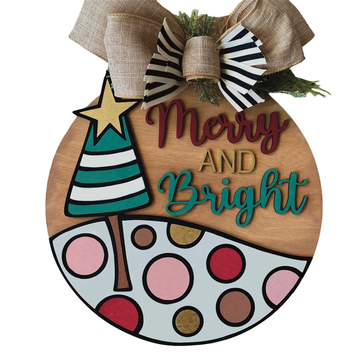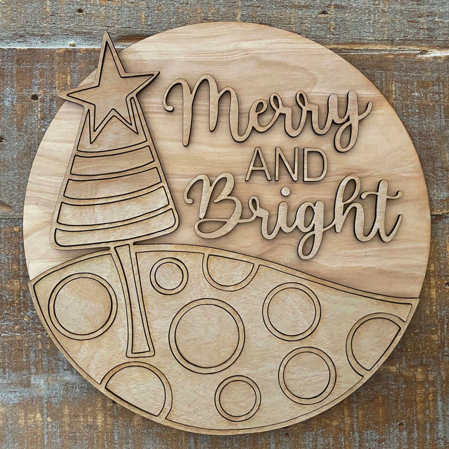 This 10" round sign features a whimsical hand-drawn graphic layered on a round backer, with the words "Merry and Bright." You can use the words included or replace them with your own wording. Shown as a laser cut file, but you could also opt to score or engrave the top graphical layer on the round backer. The top graphic layer is designed to fit perfectly on the included 10" round backer, but you can easily resize the graphic to fit a larger round if you wish.