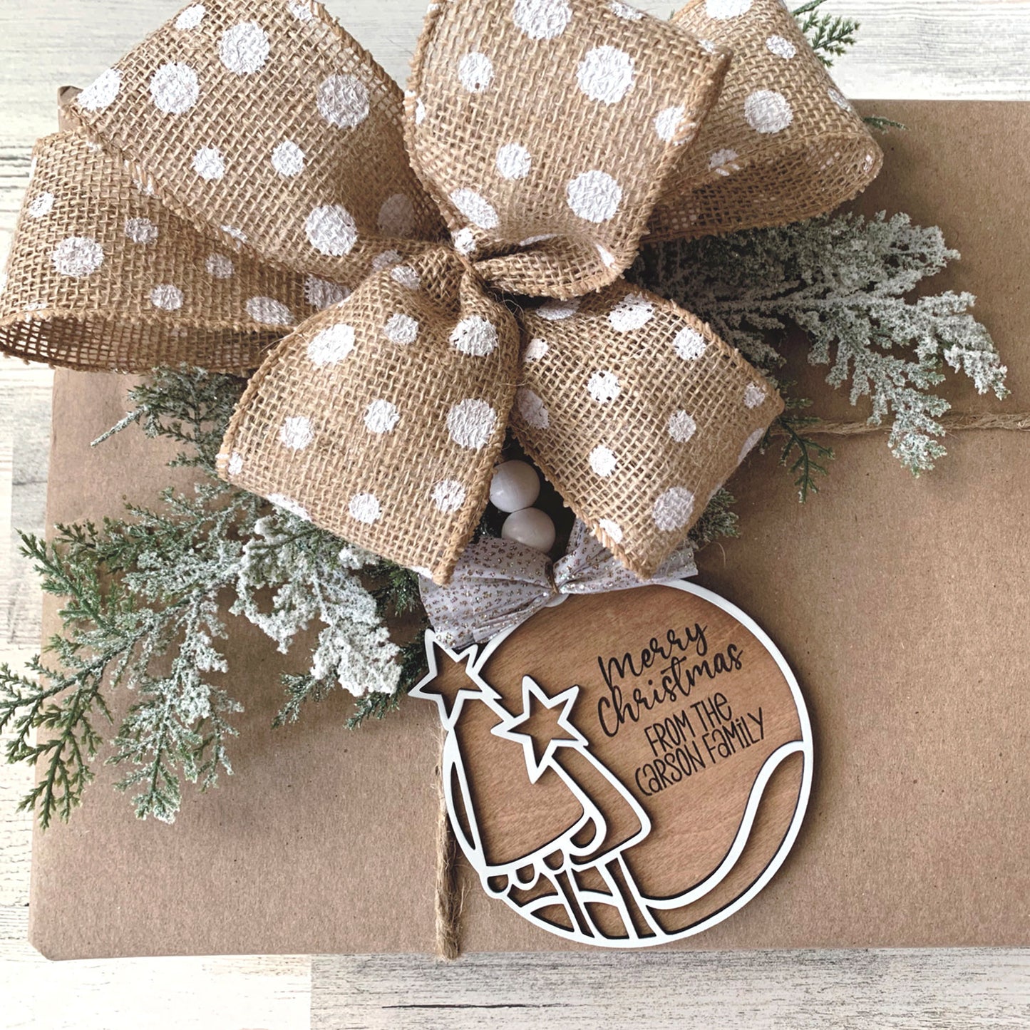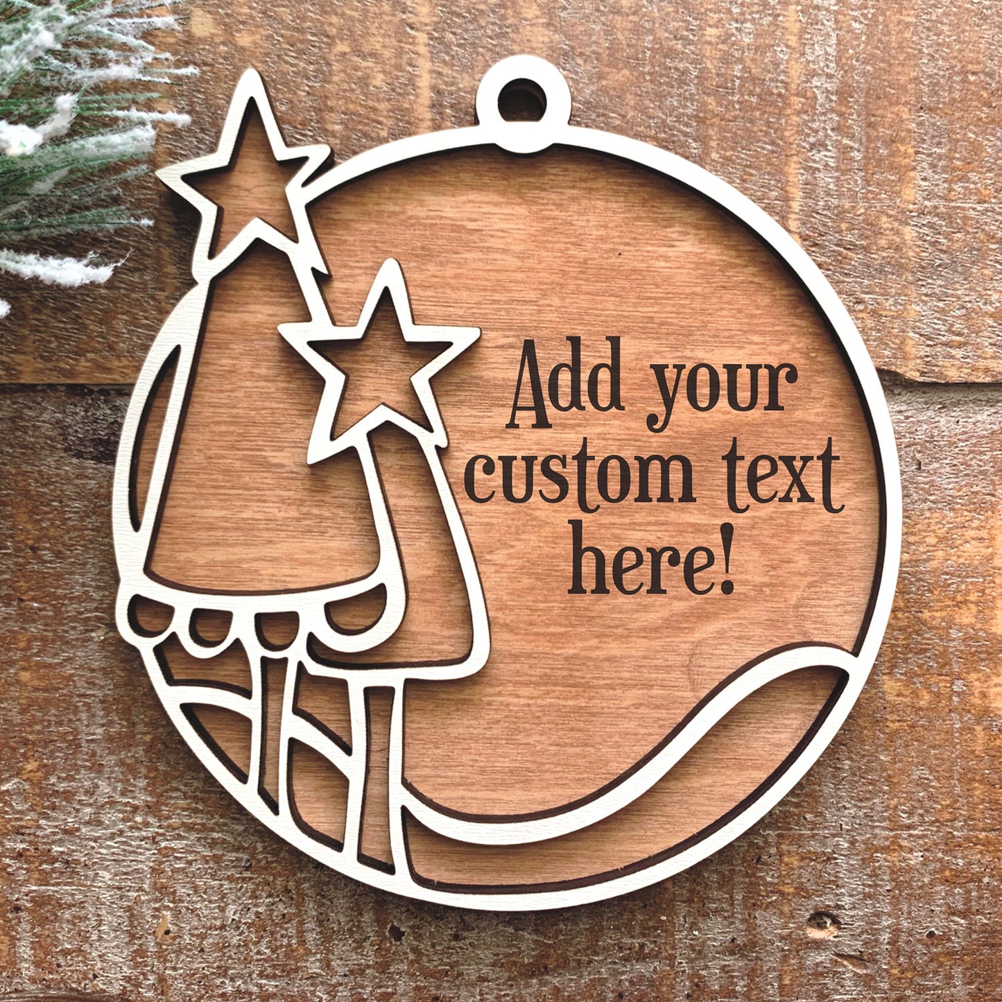 This laser cut ornament or gift tag is double-layered, with a hand-drawn set of whimsical Christmas trees on the top layer, and the base layer ready for you to add your own customized text. Makes a perfect tree ornament, or customize it with your own name/message and use it to adorn Christmas gifts. Super easy file to create and assemble, just two laser cut layers.