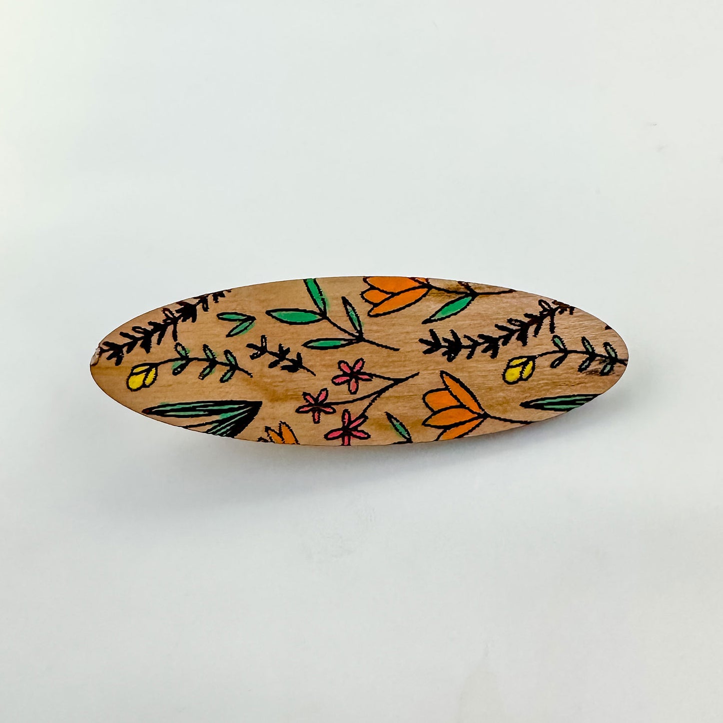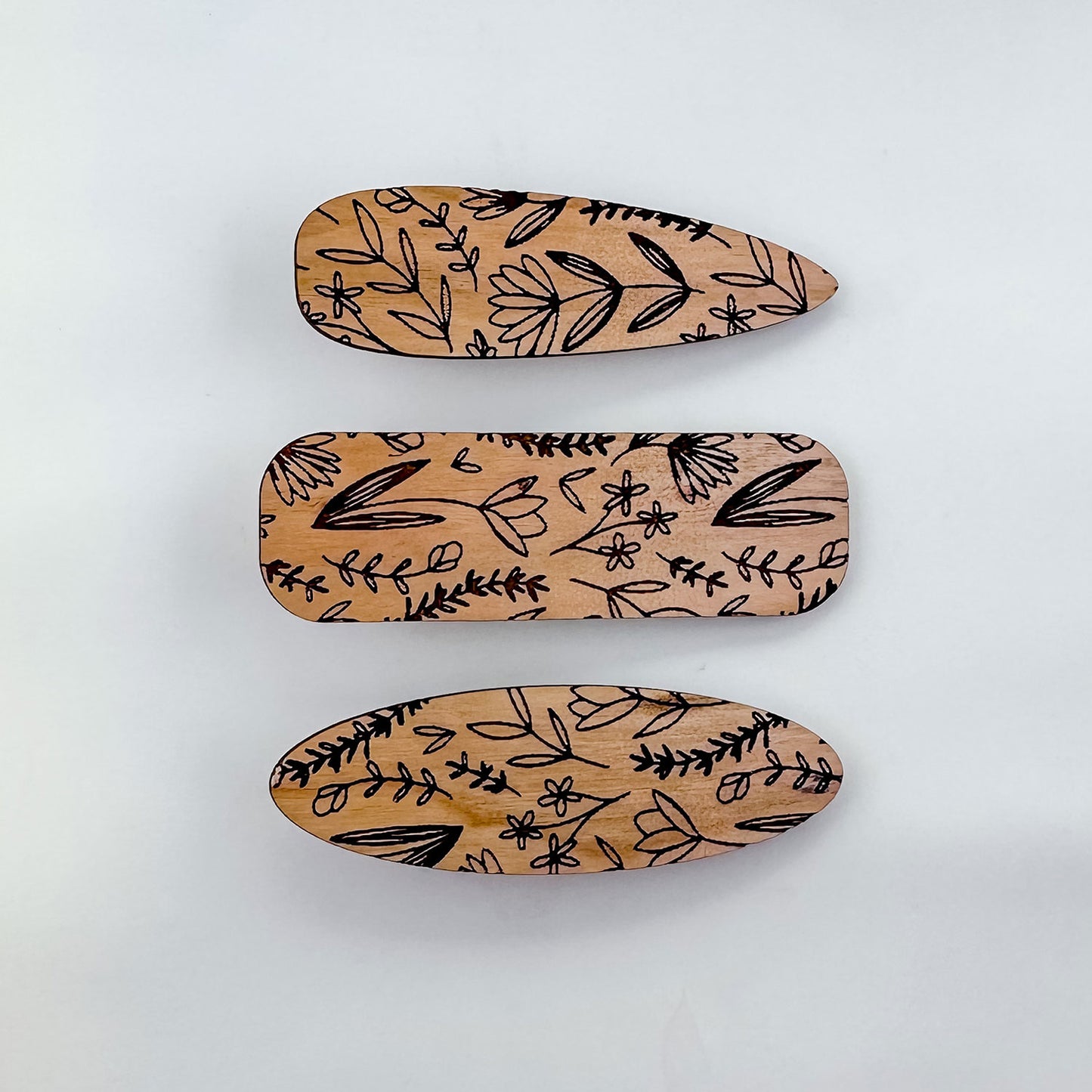 This set of laser cut hair clips has a modern shape with a cute wildflower pattern engraved on top. Add alligator hair clips to the back to make a cute hair accessory. You could even add magnets to make a cute magnet set as well. All three hair clip shapes are included in the file.