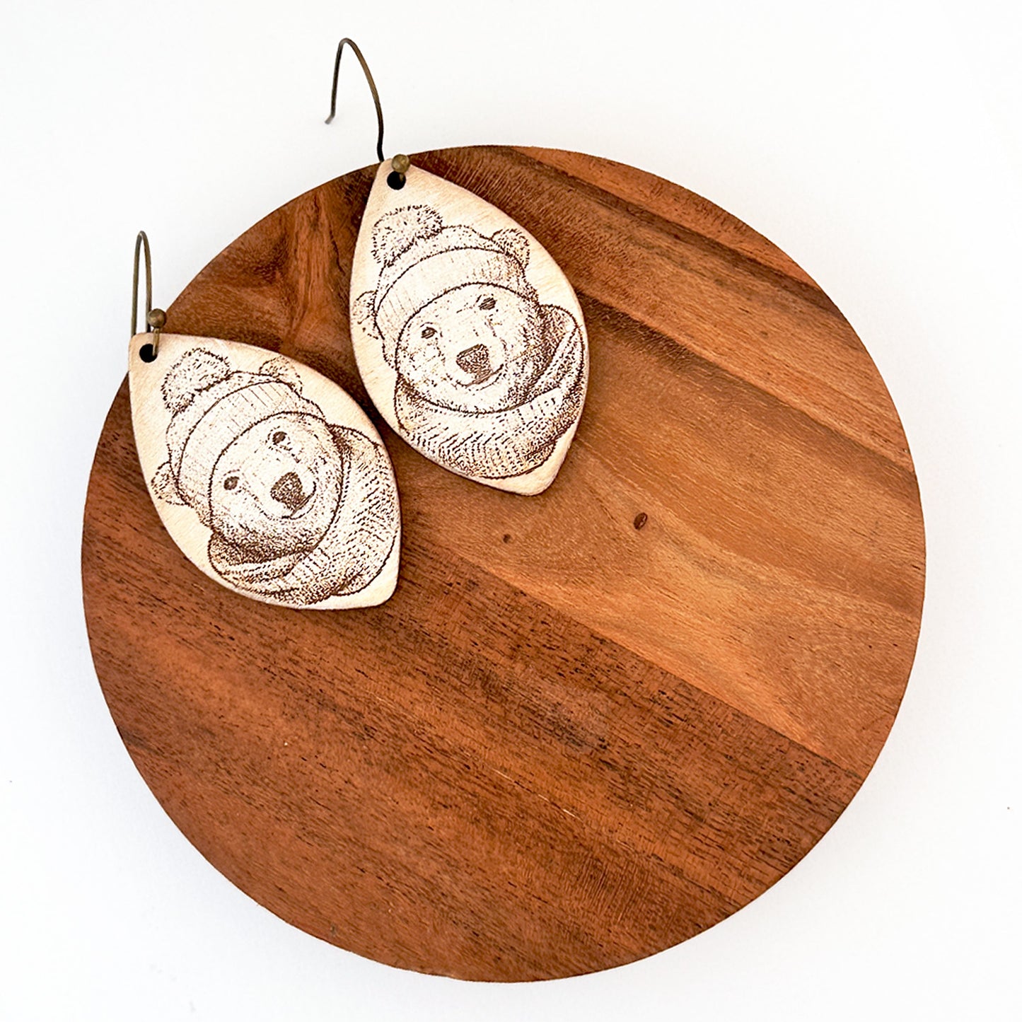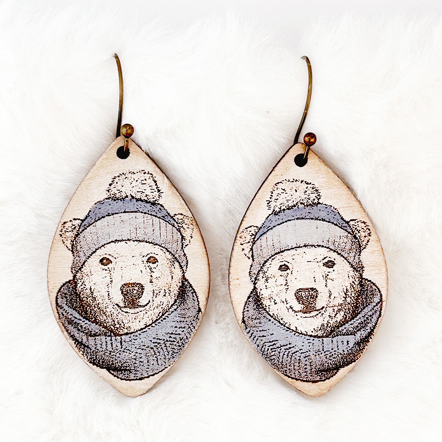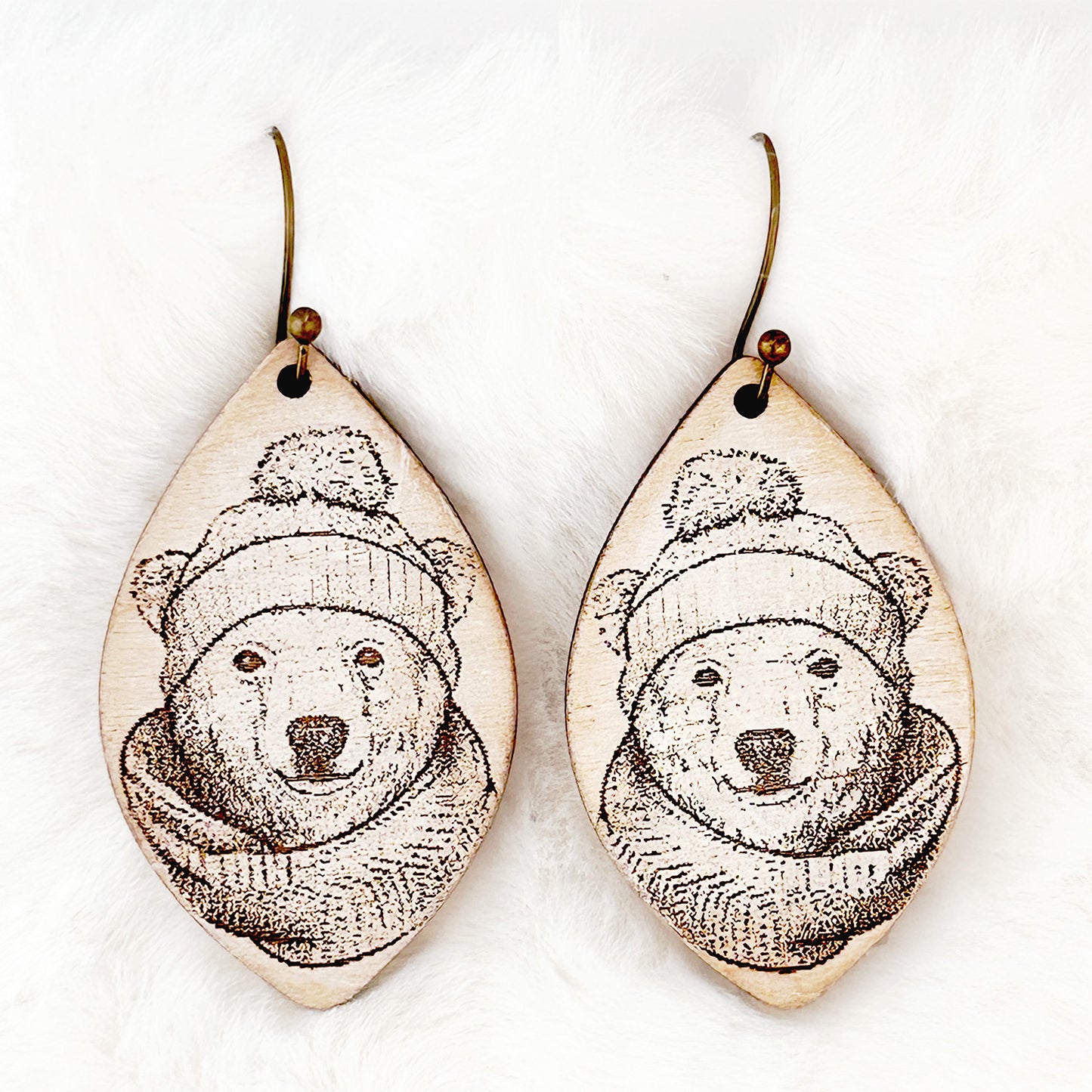 Embrace the winter season with these adorable Winter Polar Bear with Scarf Earrings. Featuring a cozy polar bear wrapped in a scarf, these laser-cut wood earrings are perfect for winter fashion, holiday parties, or as a cute and unique gift for animal lovers. Add a touch of festive fun to your outfit with these charming earrings!