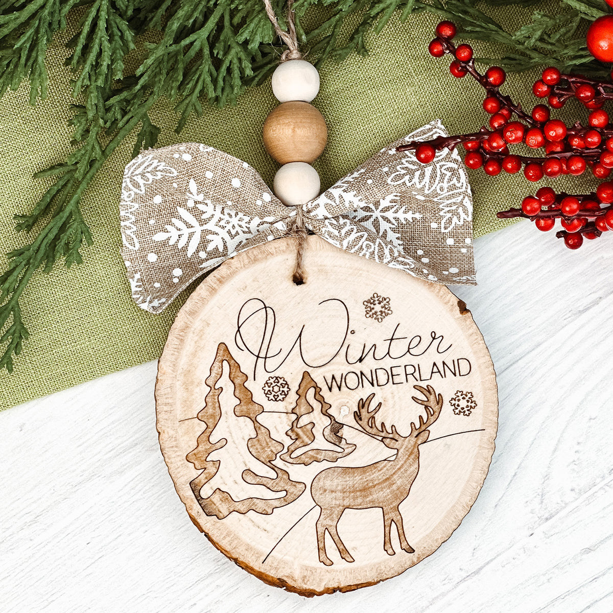 Bring the magic of winter into your home with this "Winter Wonderland" ornament SVG. Featuring a serene forest scene with a deer, trees, and snowflakes, this design is perfect for laser engraving on wood ornaments or holiday decorations. Ideal for creating rustic, woodland-themed holiday decor or gifting as a handmade ornament. Design shown is on a wood slice ornament; however, the file includes a round backer in case you don't want to use an ornament blank.