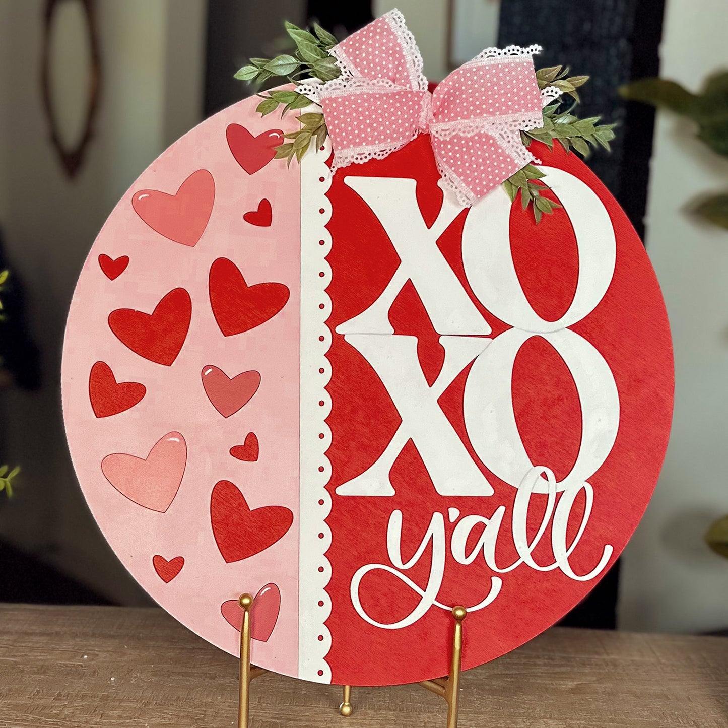 Create a festive Valentine's Day statement with this "XO Y'all" round door hanger design! Featuring a split heart cutout pattern and bold lettering, this project is perfect for adding warmth and charm to your home or gifting a loved one. Personalize with your favorite materials and paint colors for a truly custom piece.